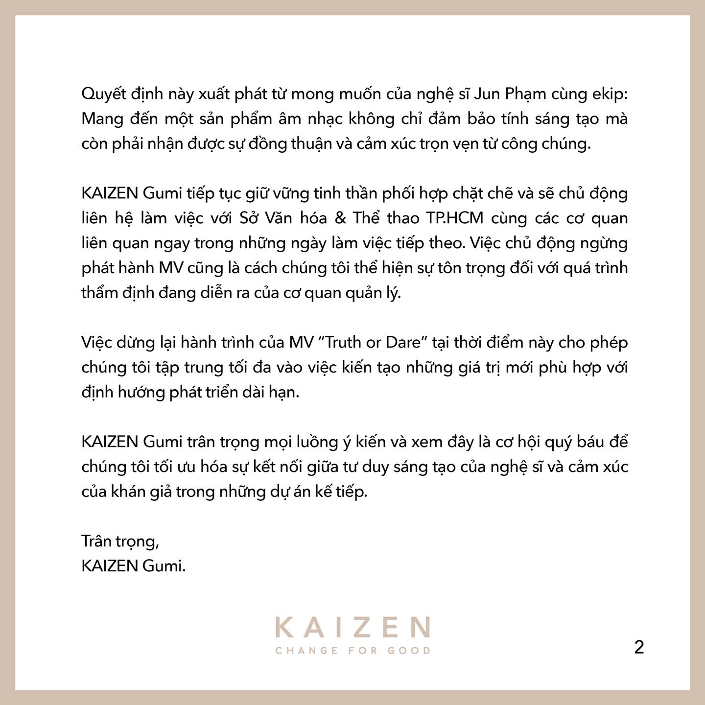 Tối 9/4, công ty quản lý Kaizen Gumi của nghệ sĩ Jun Phạm đã chính thức phát đi thông báo liên quan đến MV Truth or Dare sau khi sản phẩm này vấp phải nhiều ý kiến trái chiều từ công chúng.