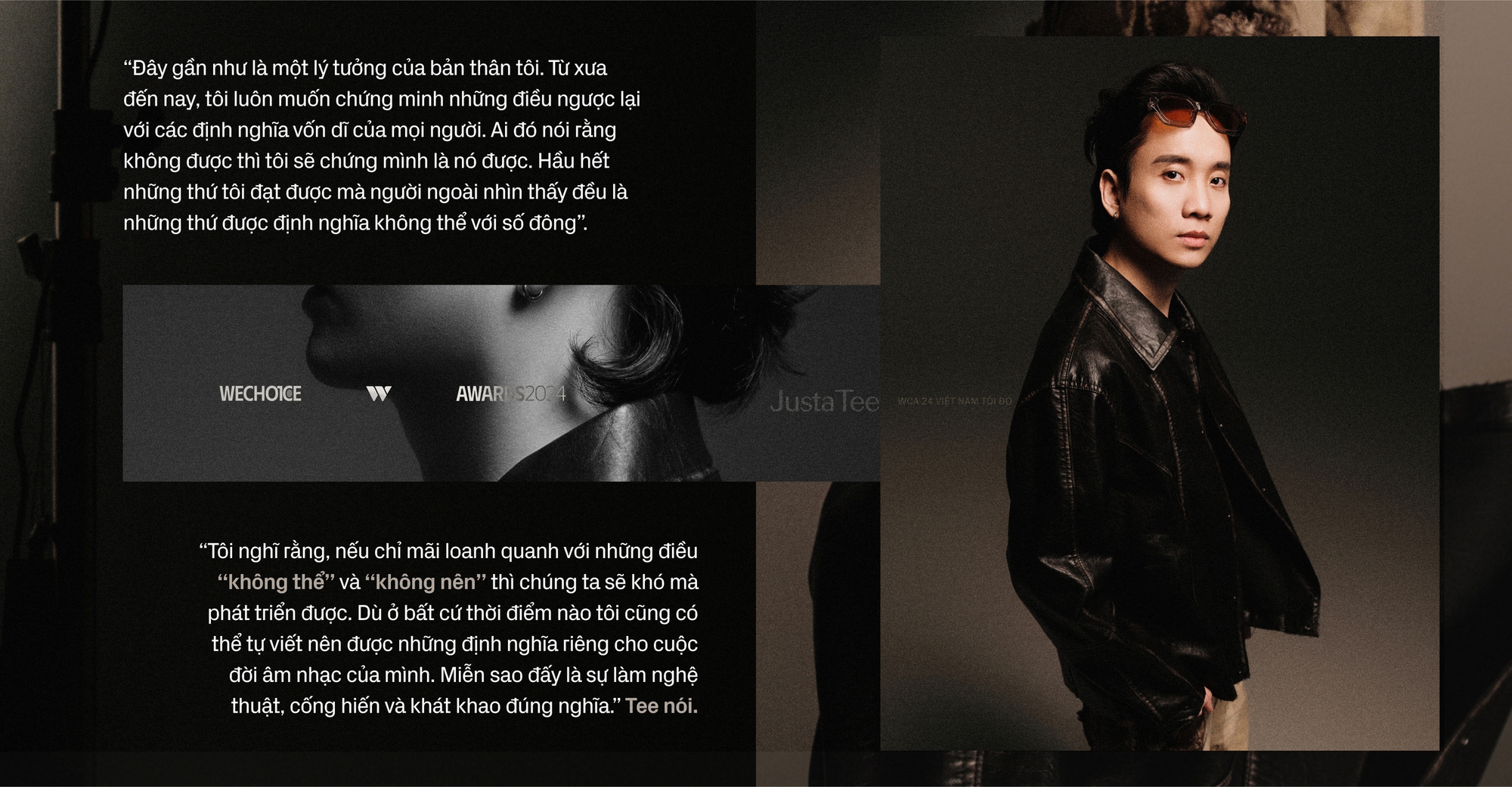 "Tôi nghĩ rằng, nếu chỉ mãi loanh quanh với những điều "không thể" và "không nên" thì chúng ta sẽ khó mà phát triển được. Dù ở bất cứ thời điểm nào tôi cũng có thể tự viết nên được những định nghĩa riêng cho cuộc đời âm nhạc của mình. Miễn sao đấy là sự làm nghệ thuật, cống hiến và khát khao đúng nghĩa." Tee nói.