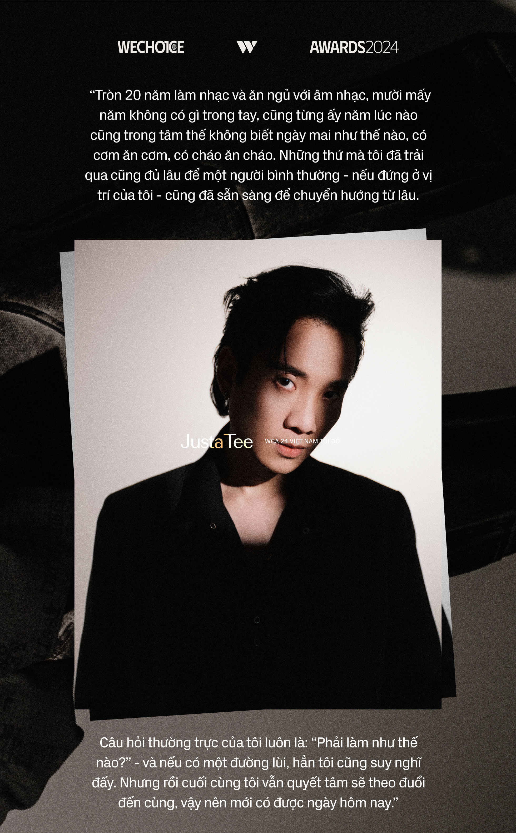 Trong mắt người ngoài, những gì JustaTee có được dường như rất dễ dàng, quá nhanh và quá thuận lợi. Nhưng với Tee, đó là cả một hành trình lăn lộn suốt 20 năm để có được. "Tròn 20 năm làm nhạc và ăn ngủ với âm nhạc, mười mấy năm không có gì trong tay, cũng từng ấy năm lúc nào cũng trong tâm thế không biết ngày mai như thế nào, có cơm ăn cơm, có cháo ăn cháo. Những thứ mà tôi đã trải qua cũng đủ lâu để một người bình thường - nếu đứng ở vị trí của tôi - cũng đã sẵn sàng để chuyển hướng từ lâu. Câu hỏi thường trực của tôi luôn là: "Phải làm như thế nào?" - và nếu có một đường lùi, hẳn tôi cũng suy nghĩ đấy. Nhưng rồi cuối cùng tôi vẫn quyết tâm sẽ theo đuổi đến cùng, vậy nên mới có được ngày hôm nay."