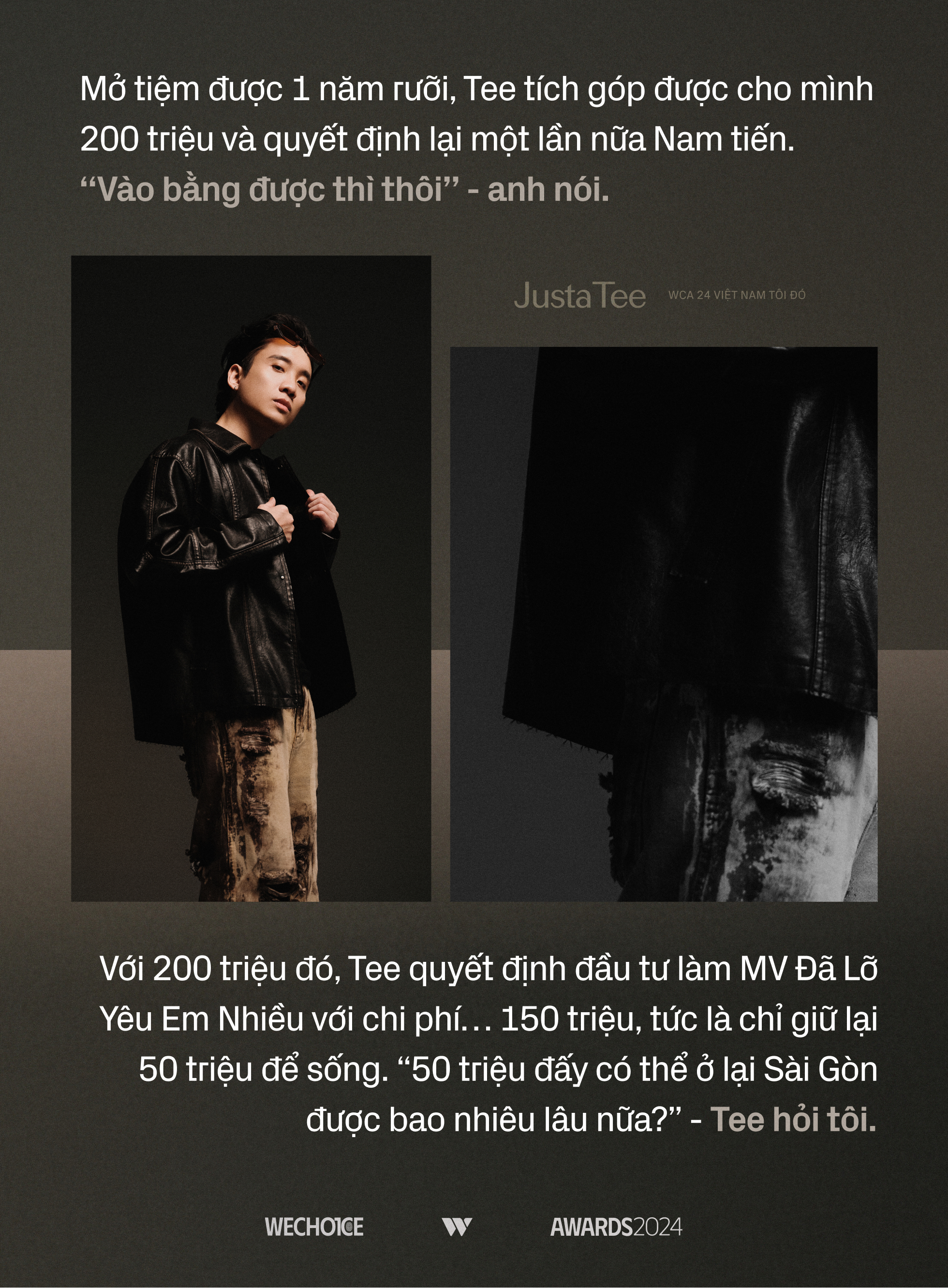 Mở tiệm được 1 năm rưỡi, Tee tích góp được cho mình 200 triệu và quyết định lại một lần nữa Nam tiến. "Vào bằng được thì thôi" - anh nói. Với 200 triệu đó, Tee quyết định đầu tư làm MV Đã Lỡ Yêu Em Nhiều với chi phí… 150 triệu, tức là chỉ giữ lại 50 triệu để sống. "50 triệu đấy có thể ở lại Sài Gòn được bao nhiêu lâu nữa?" - Tee hỏi tôi.