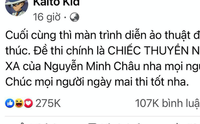 Năm nay, trước kỳ thi, tài khoản này đăng dòng trạng thái: "Cuối cùng thì màn trình diễn ảo thuật đã kết thúc. Đề thi chính là CHIẾC THUYỀN NGOÀI XA của Nguyễn Minh Châu nha mọi người. Chúc mọi người ngày mai thi tốt nha". Trên thực tế, đề thi ra đúng vào tác phẩm "Chiếc thuyền ngoài xa".