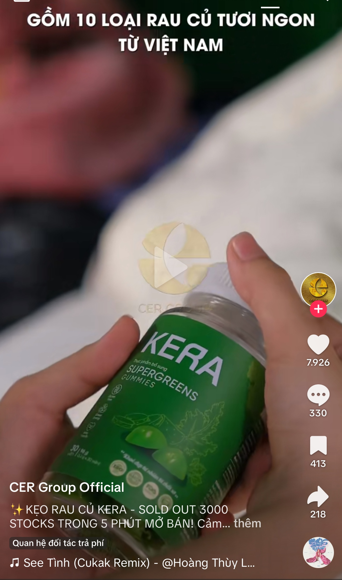 Trong phiên livestream trên kênh Tiktok của Công ty Cổ phần Tập đoàn Chị Em Rọt (CER group) ngày 12/12/2024 đăng tải bài viết: "Kẹo rau củ Kera - Sold out 3.000 stocks trong 5 phút mở bán".