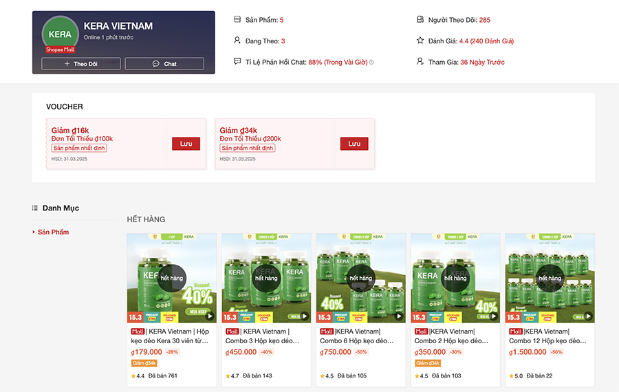 Thương hiệu KERA Việt Nam còn có mall trên sàn TMĐT nhưng tất cả sản phẩm đều đồng loạt "hết hàng".