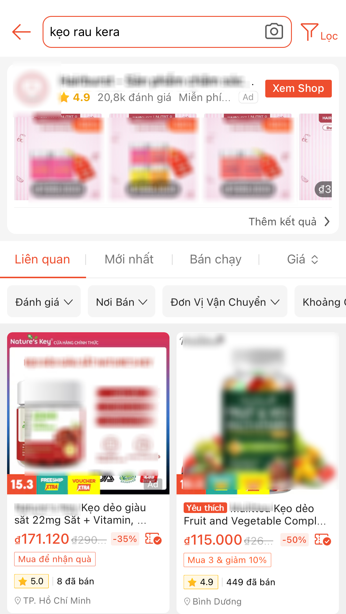 Tìm kiếm trên các sàn TMĐT, dù tìm kiếm sản phẩm "kẹo rau KERA" nhưng kết quả lại cho ra một loạt sản phẩm khác, chứ không hề có bóng dáng của lọ kẹo này.