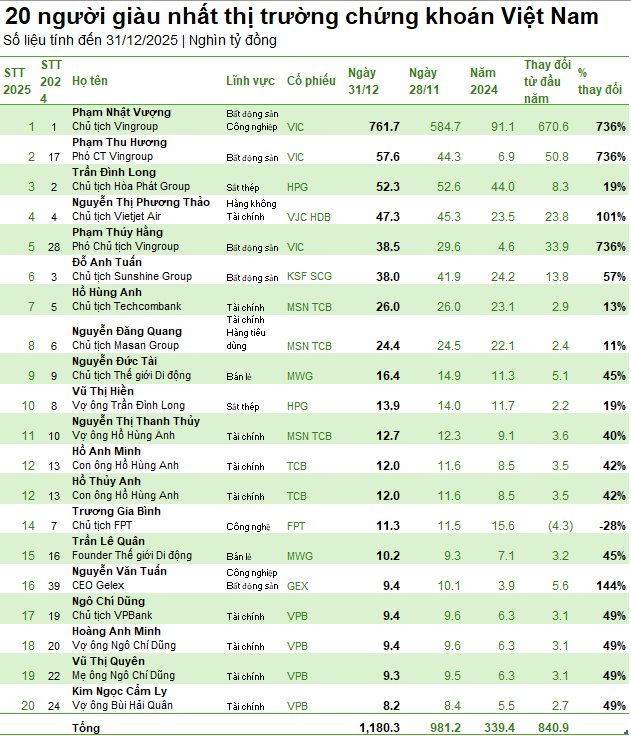 Kết phiên giao dịch cuối cùng của năm 2025, tổng giá trị tài sản của 20 người giàu nhất thị trường chứng khoán Việt Nam đạt 1,18 triệu tỷ đồng, tăng mạnh so với đầu năm.