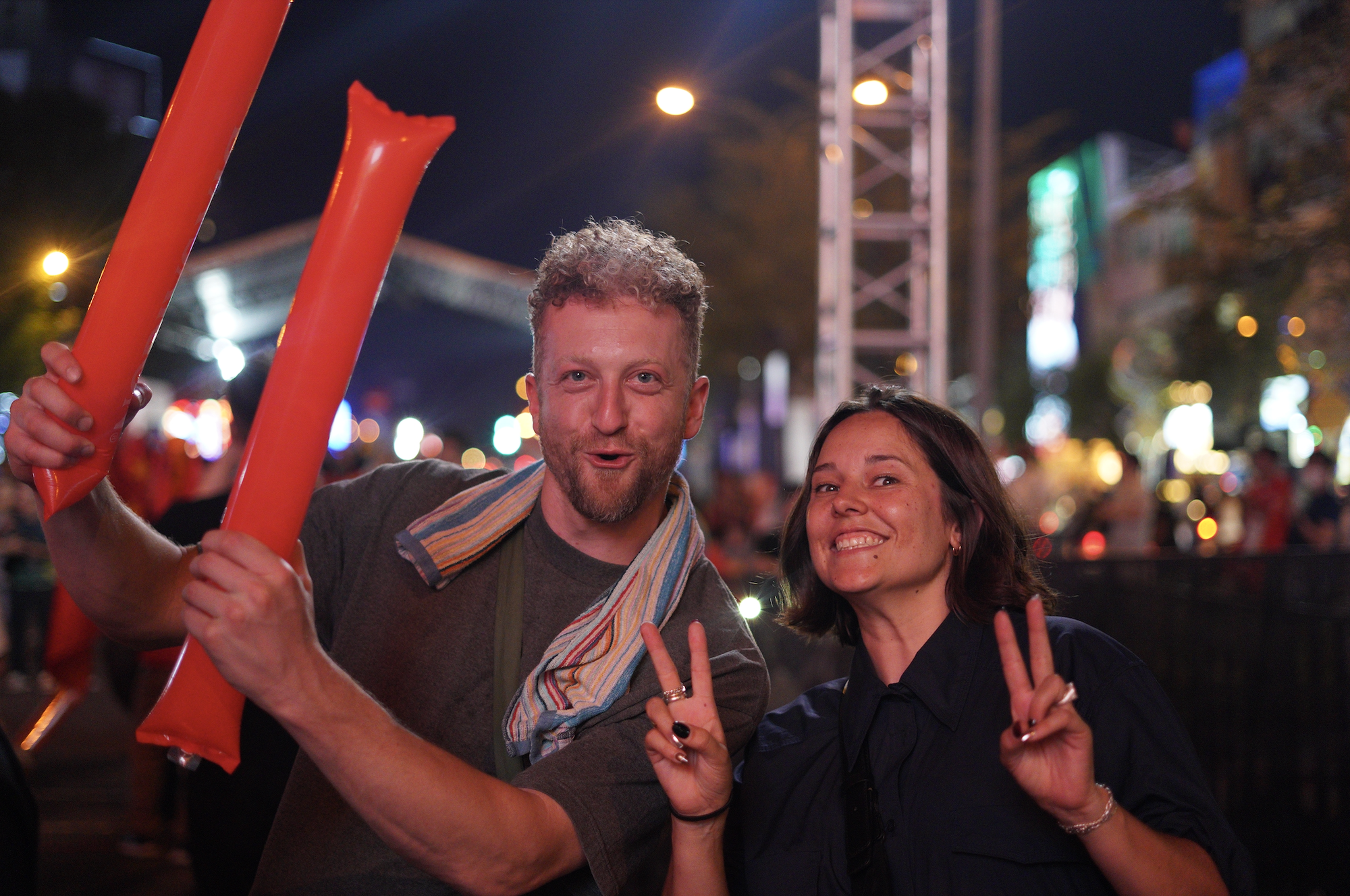 Giữa dòng người nườm nượp, các cổ động viên hô vang khẩu hiệu quen thuộc "Việt Nam vô địch", gọi tên những khoảnh khắc tự hào của bóng đá nước nhà. Và trong biển người ấy, không khó để bắt gặp những gương mặt ngoại quốc cũng đang hoà chung nhịp đập cảm xúc.