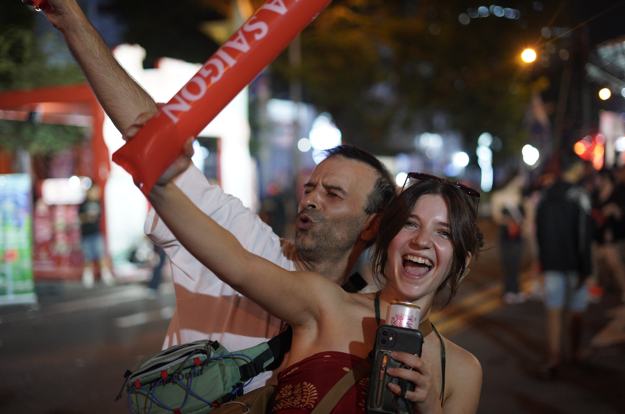 Điểm chung dễ nhận thấy ở những vị khách này là nụ cười rạng rỡ và tinh thần phấn khích lan toả. Họ hào hứng hô theo, vẫy tay, chụp ảnh, quay video và tận hưởng trọn vẹn niềm vui chiến thắng cùng người dân bản địa. Trong khoảnh khắc ấy, mọi ranh giới dường như không còn, tất cả cùng chung một cảm xúc: niềm vui khi Việt Nam lên ngôi vô địch.