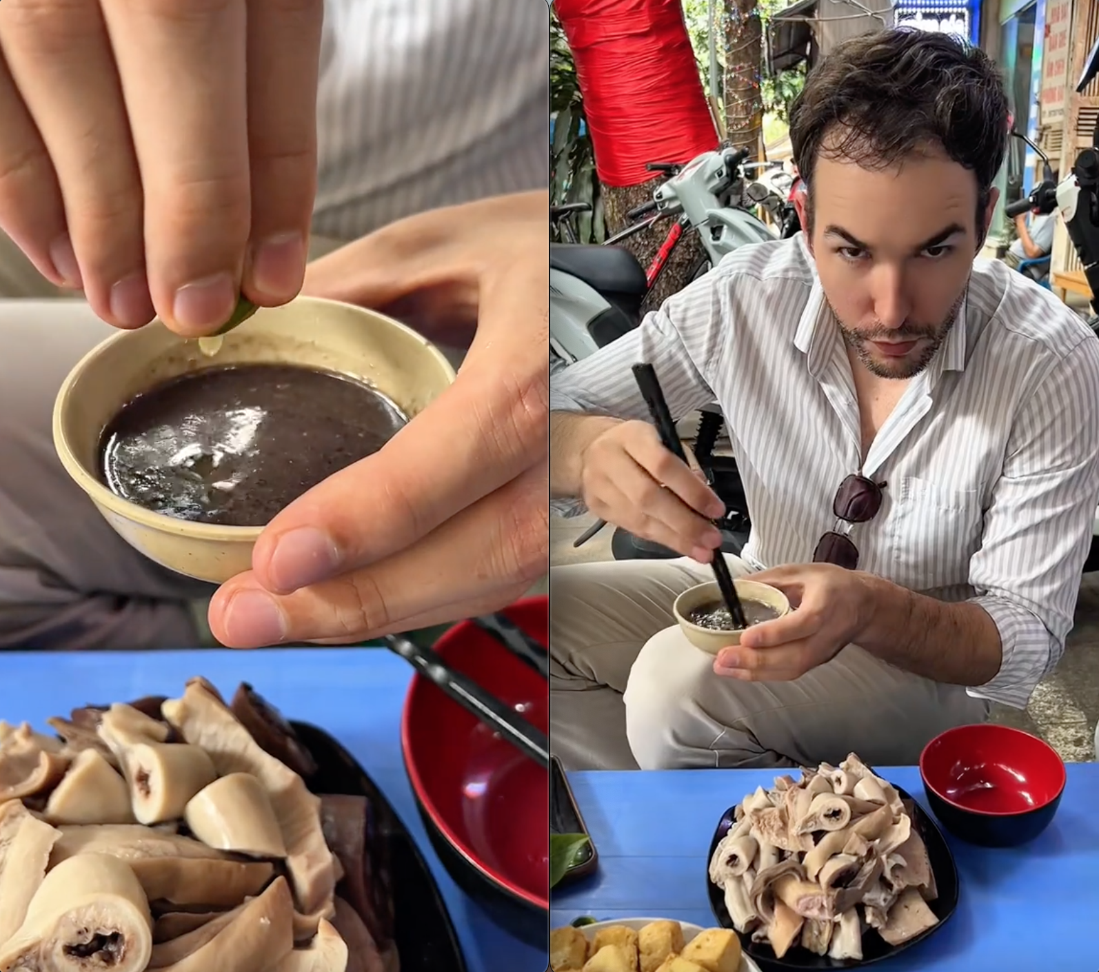 Trong video, Will ghé vào một quán lòng dân dã, ngồi xuống gọi một đĩa "lòng se điếu" chấm mắm tôm. Anh chàng Tây ngồi xuống, tự tin gọi ngay một đĩa "lòng se điếu" cùng bát mắm tôm - combo khiến không ít người nước ngoài phải e dè. Điều gây ấn tượng là cách Will khuấy mắm tôm cực kỳ chuyên nghiệp: anh vắt chanh, thêm ớt rồi khuấy đều tay đến khi bát mắm bông lên sánh mịn, chuẩn bài như người sành ăn.