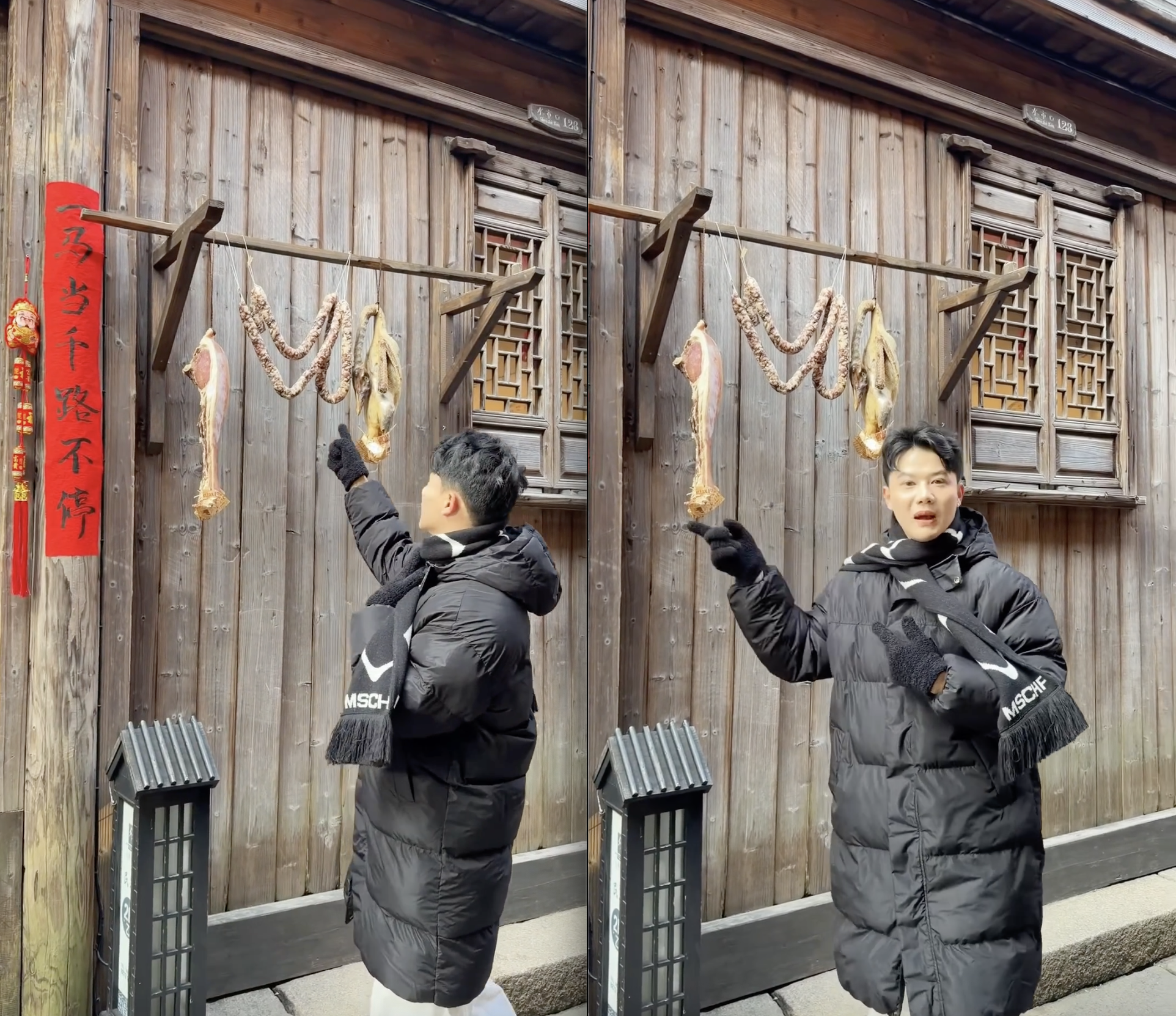 Trong hành trình ghé thăm Ô Trấn (Chiết Giang) - một cổ trấn nổi tiếng với những mái nhà đen cổ kính và kênh nước uốn lượn - Vĩnh Thích Ăn Ngon tình cờ đi ngang qua một quán ăn địa phương. Và rồi anh chàng phải khựng lại khi chứng kiến cảnh tượng trước cửa quán: người ta treo la liệt đủ loại thịt: từ thịt lợn, thịt vịt cho đến những dải lạp xưởng đỏ au. Tất cả đều được phơi thẳng ra ngoài đường, ngay trước tầm mắt người qua lại.