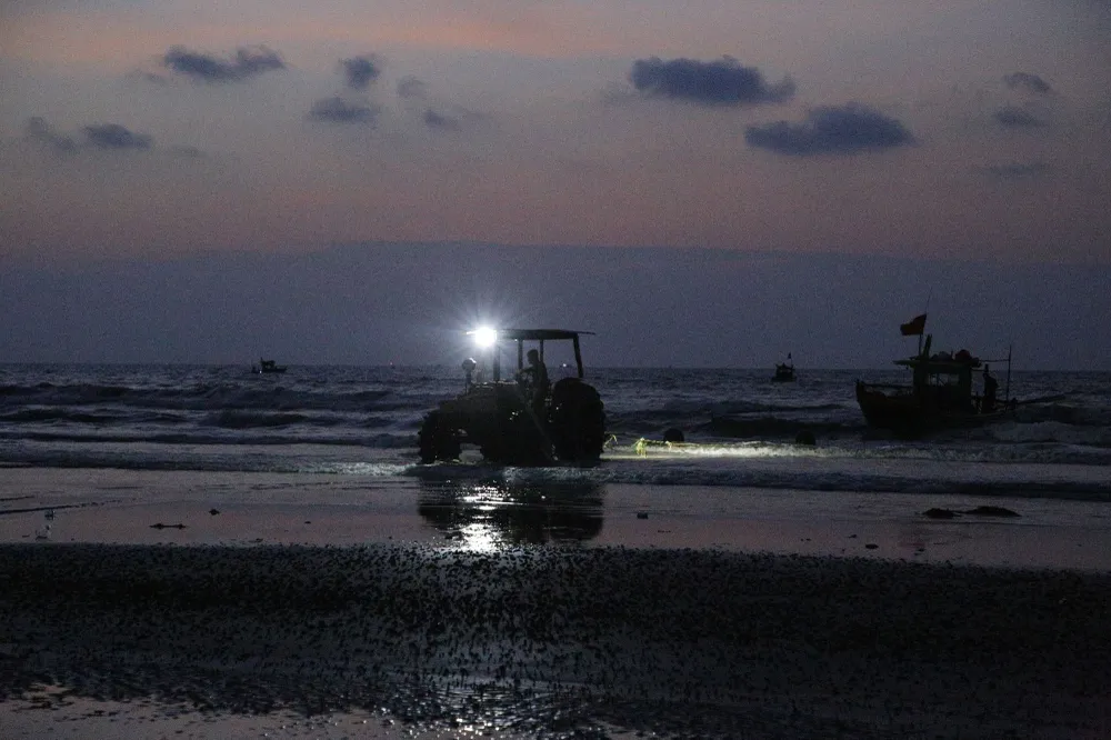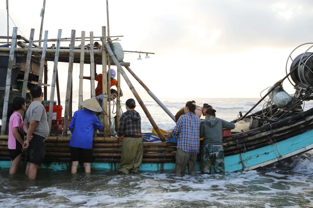Từ trong làng, dưới những tán cây phi lao, các máy kéo bắt đầu đưa thuyền, bè mảng cùng ngư dân ra biển, bắt đầu hành trình đánh bắt. Trong khi đó, trên bãi biển đã có rất nhiều trục bánh xe nằm la liệt, chứng tỏ đã có nhiều bè mảng ra khơi trước đó. Đây là loại bánh xe dùng để “gá” vào thuyền, bè mảng, sau đó máy kéo sẽ kéo ra biển hoặc vào bờ thay cho sức người.