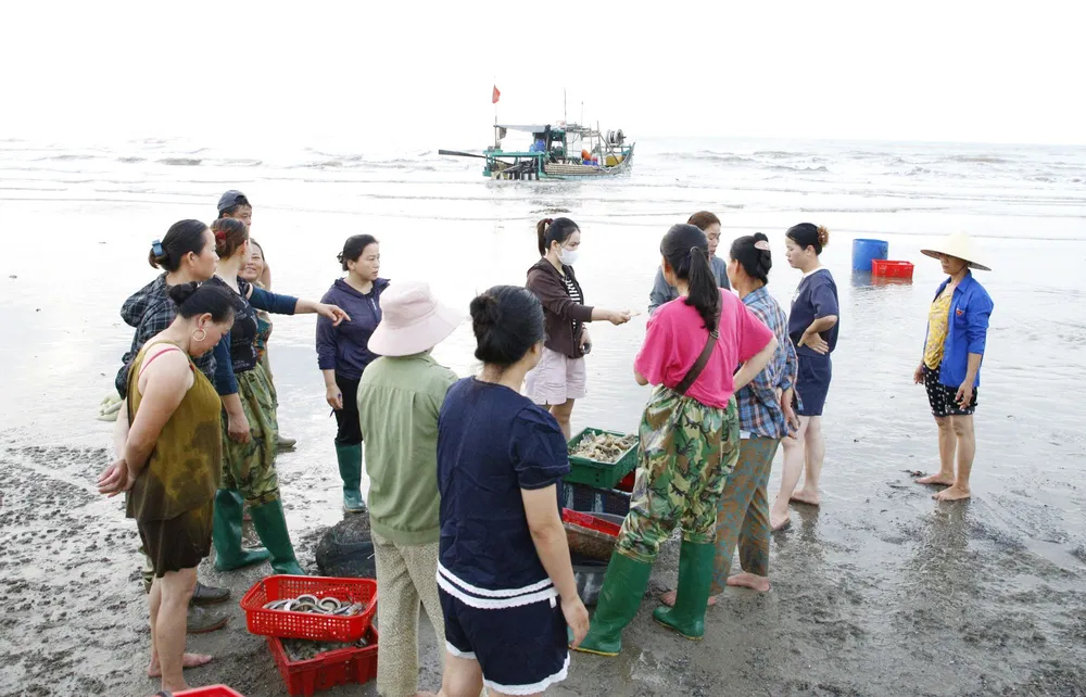 Khoảng 5 giờ sáng, không gian bãi biển bắt đầu náo nhiệt hẳn lên. Tiếng máy kéo, máy tời, tiếng xe máy hòa lẫn trong tiếng nói cười rộn vang cả một vùng. Người làng biển vốn “ăn sóng nói gió” nên từ đàn ông cho đến phụ nữ ai cũng nói to.