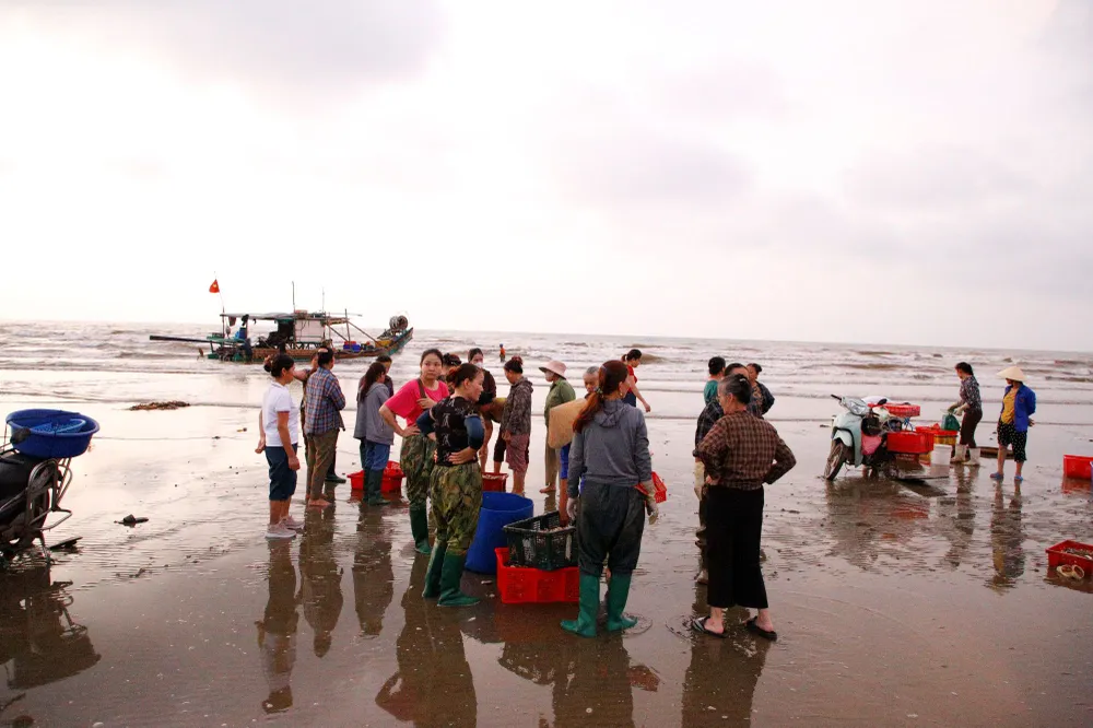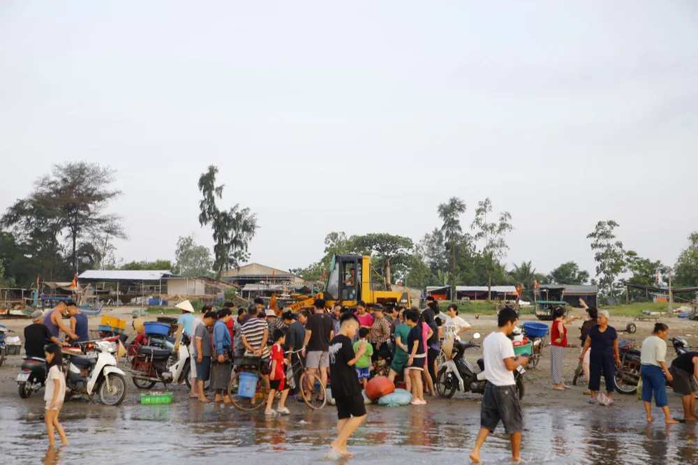 Trời càng dần về sáng càng có nhiều xe máy từ các hướng đổ ra bãi biển. Lúc này, những người phụ nữ của làng biển cũng bắt đầu ra bãi biển ngồi đợi bè mảng, thuyền nhà mình về.