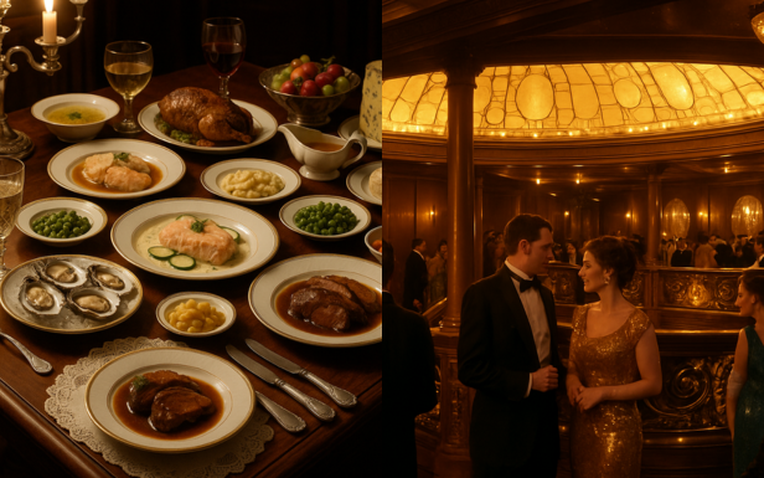 Thực đơn được phục vụ cho những hàng khách khoang hạng nhất đêm đó do Bonhams Auction House (nơi từng đấu giá bản thực đơn Titanic gốc) cung cấp cho biết có tất cả tổng cộng 11 món: hàu sống, súp kem, cá hồi sốt Mousseline, vịt quay sốt táo, cừu nướng bạc hà, thịt bò quay sốt rượu vang đỏ... được dùng kèm hàng chục loại rượu vang hảo hạng. Mọi giác quan đều được ve vuốt bằng sự xa xỉ nhưng không ai ngờ đó là bữa tiệc cuối cùng.