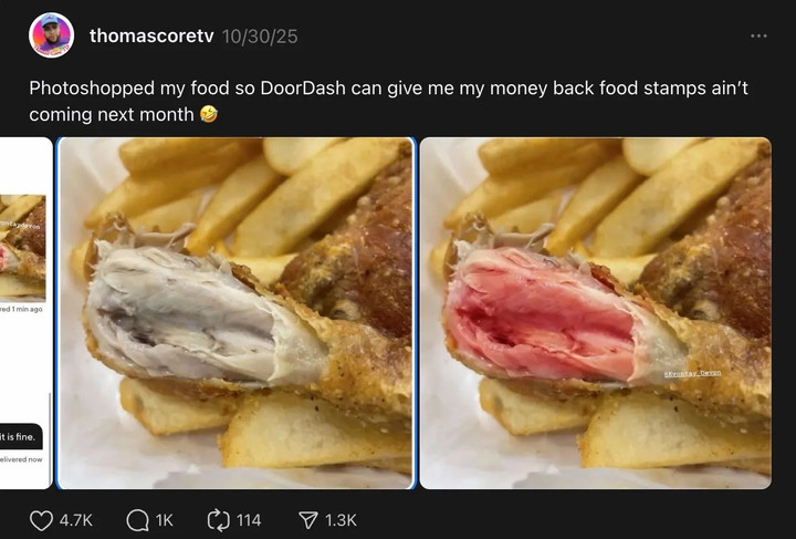 “Tôi đã chỉnh sửa ảnh đồ ăn để DoorDash hoàn tiền cho tôi, vì tháng tới phiếu trợ cấp thực phẩm không đến" , người này viết, không giấu giếm ý định trục lợi.