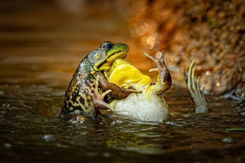 Grayson Bell, 13 tuổi, đến từ Mỹ, đoạt giải ở hạng mục bò sát, lưỡng cư và côn trùng cùng giải dành cho nhiếp ảnh gia trẻ dưới 16 tuổi với bức ảnh 2 con ếch đang vật lộn trong nước, được đặt tên Baptism of the Unwilling Convert .
