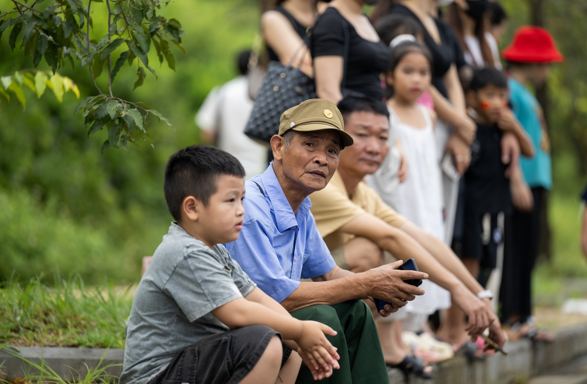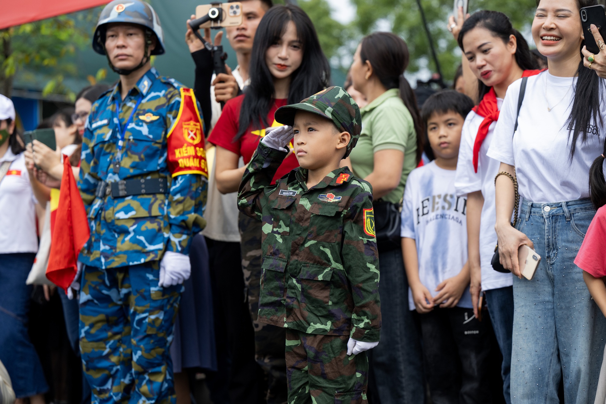 Một em bé trong trang phục quân nhân đứng trang nghiêm chào khi đoàn diễu binh đi ngang. Gương mặt, ánh mắt và tác phong của cậu bé mang đến niềm vui lớn cho mọi người.