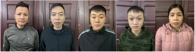 Các đối tượng Hưng, Chiến, Trường, Vinh, Tuyết (tính từ trái qua phải) (Ảnh: Công an Hưng Yên).
