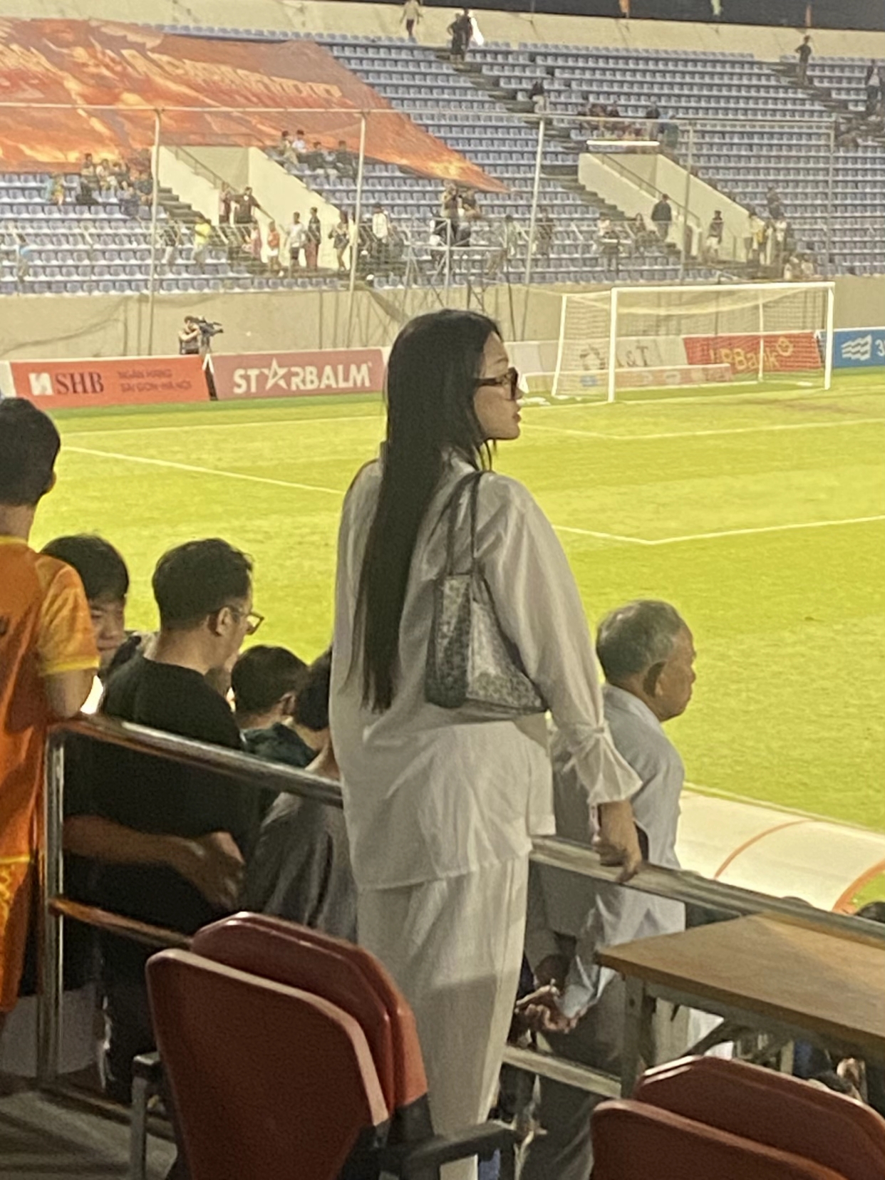 Trong bức ảnh bị “team qua đường” ghi lại, Doãn Hải My đứng tựa lan can, chăm chú dõi theo từng diễn biến trên sân - nơi Đoàn Văn Hậu đang thi đấu. Không còn nụ cười rạng rỡ hay thần thái “nàng thơ” quen thuộc, cô mang đến hình ảnh nghiêm túc, có phần lạnh lùng và tập trung.