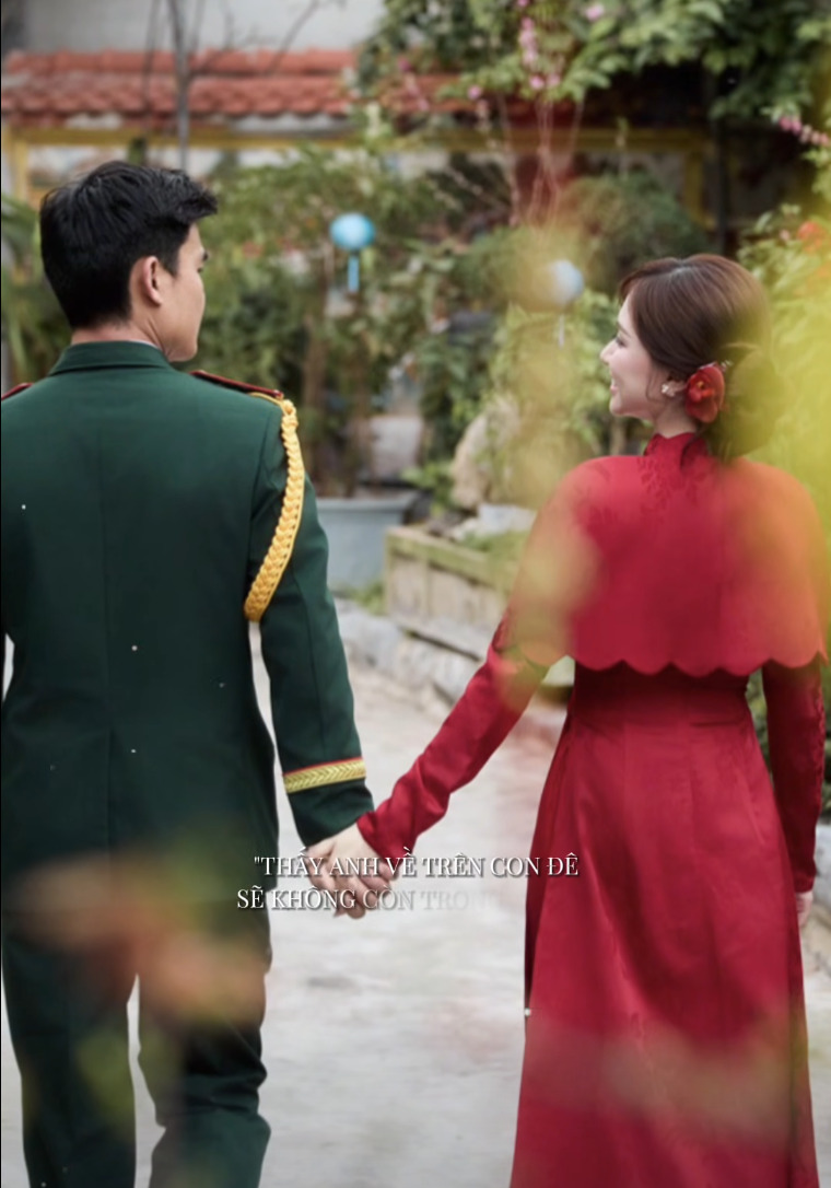 Tối 6/3, hình ảnh Hòa Minzy diện áo dài đỏ, nắm tay một chàng trai mặc quân phục. Ảnh: FBNV