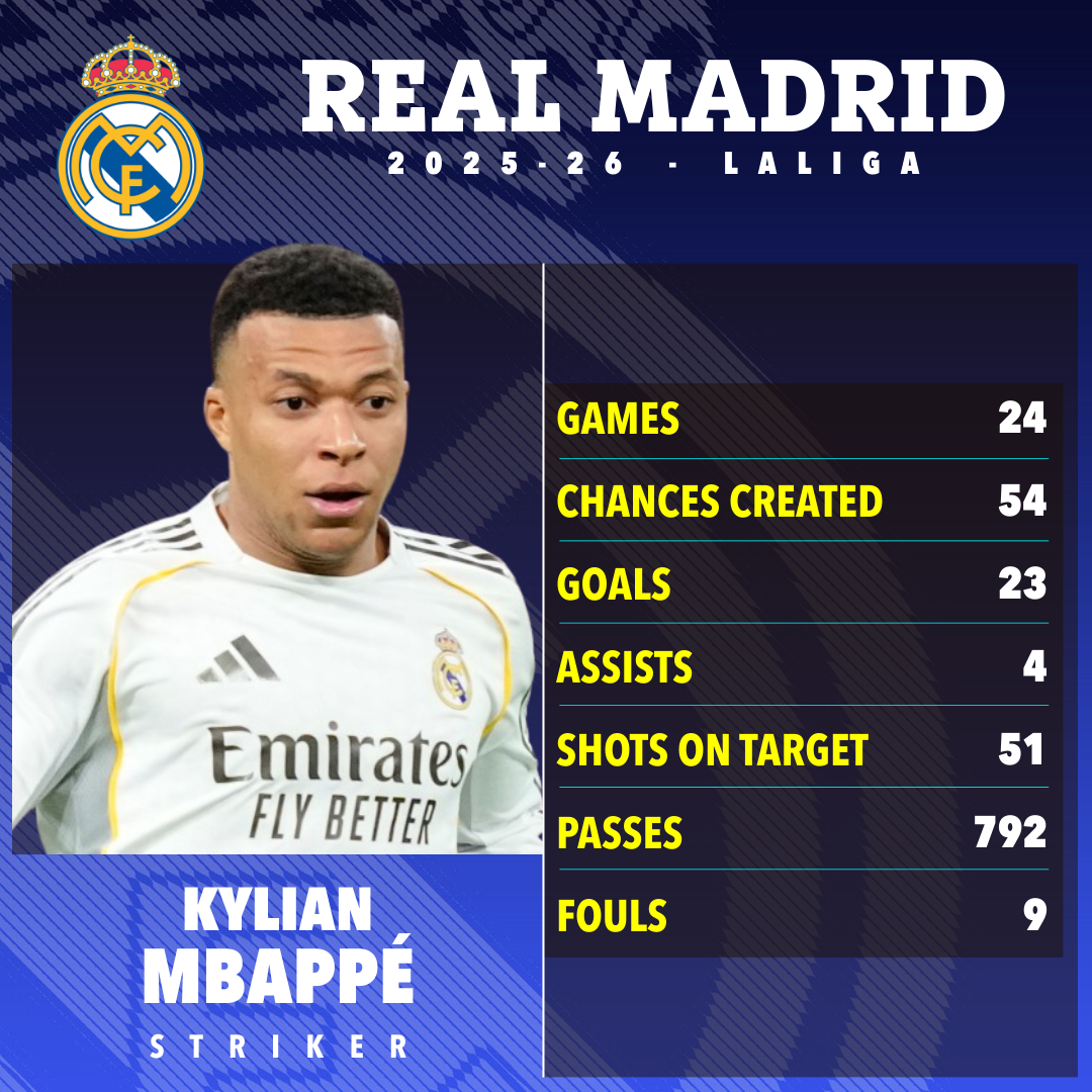 Bất chấp quãng nghỉ vì chấn thương, phong độ của Mbappe mùa này vẫn cực kỳ ấn tượng. Anh đã ghi 23 bàn sau 24 trận tại La Liga, nhiều hơn đồng đội Vinicius Junior tới 5 bàn. Ở Champions League, chân sút người Pháp cũng đang dẫn đầu danh sách ghi bàn với 13 pha lập công, vượt trên Harry Kane và Anthony Gordon.
