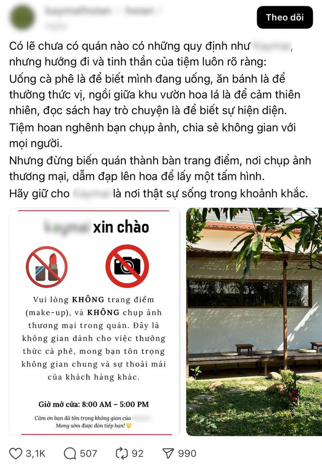 Tại Hội An, một quán cà phê nhỏ bất ngờ thu hút sự chú ý của cộng đồng mạng sau khi đăng tải loạt quy định dành cho khách đến quán. Trong bài viết chia sẻ trên nền tảng Threads, quán đưa ra yêu cầu không mang đồ trang điểm vào sử dụng tại chỗ, hạn chế chụp ảnh mang tính thương mại và khuyến khích khách chỉ tận hưởng như thưởng thức cà phê, ngắm cảnh, trò chuyện. Cụ thể:
