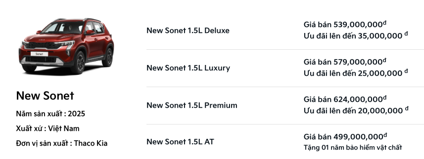 Bắt đầu từ tháng 9, Kia Sonet thêm phiên bản 1.5 AT tiêu chuẩn mới. Bản này có giá niêm yết 499 triệu đồng. Như vậy, Sonet có tổng cộng 4 phiên bản, giá 499-624 triệu đồng.