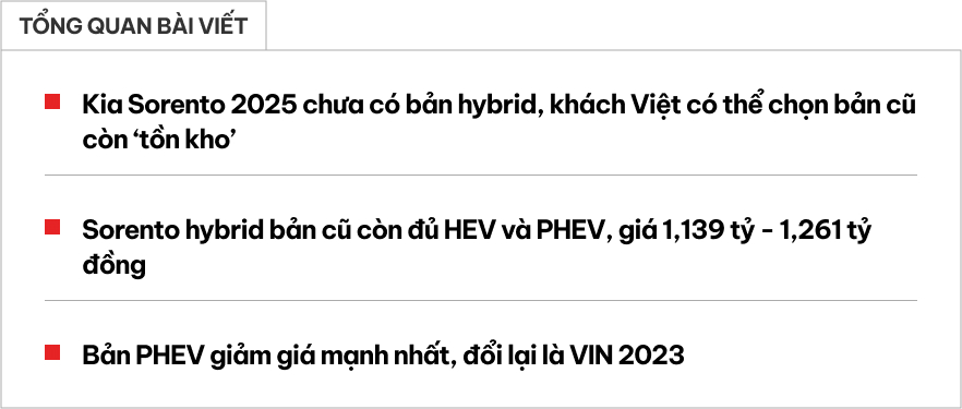 Trong khi đó, Sorento mẫu cũ lại có tới 2 tùy chọn động cơ hybrid gồm HEV và PHEV. Các bản hybrid này hiện còn bán tại đại lý với giá giảm sâu. Giá thực tế của 3 bản hybrid của Sorento còn bán tại đại lý từ 1,139 tỷ đến 1,261 tỷ đồng. Trong đó, bản PHEV cao cấp nhất có số VIN 2023. Đó cũng là lý do khiến bản này giảm giá nhiều nhất.