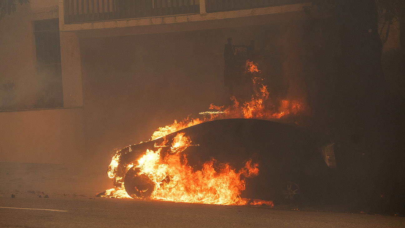 Một chiếc ô tô bốc cháy trên đại lộ Sunset khi đám cháy bùng phát vào ngày 7 tháng 1 tại khu phố Pacific Palisades (Ảnh: Apu Gomes/Getty Images)