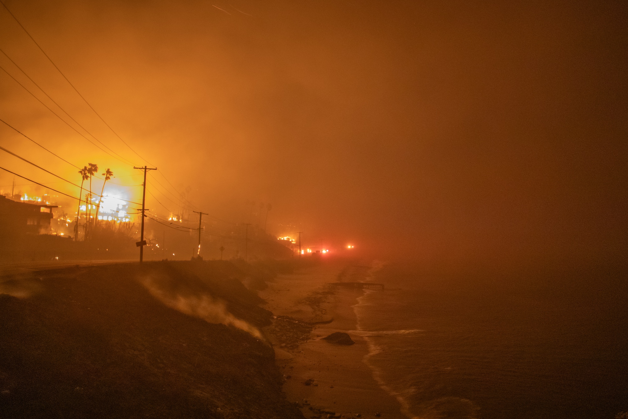 Đám cháy Palisades thiêu rụi những ngôi nhà trên Đường cao tốc Bờ biển Thái Bình Dương trong cơn gió mạnh vào tháng 1 tại Los Angeles, California
