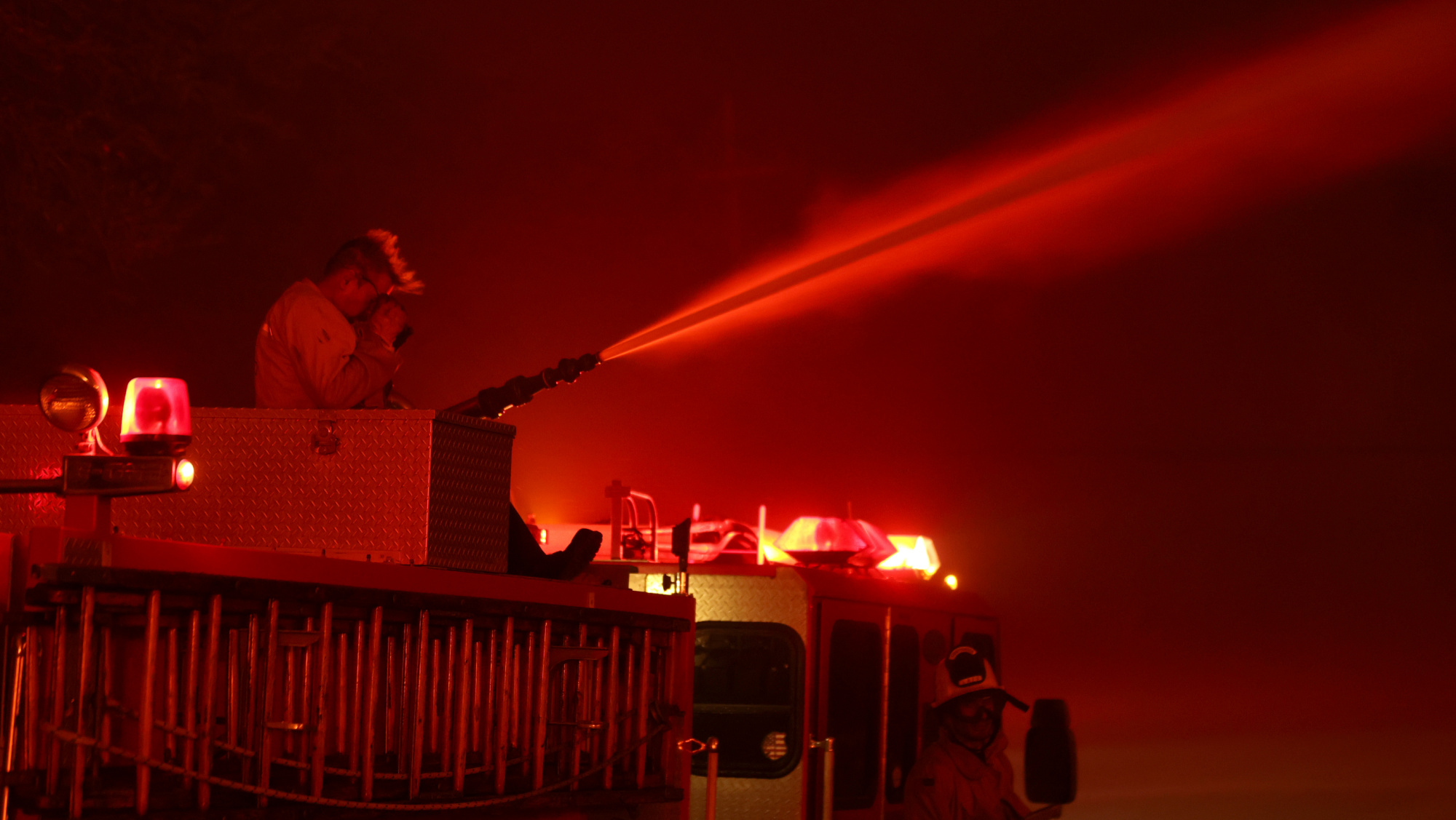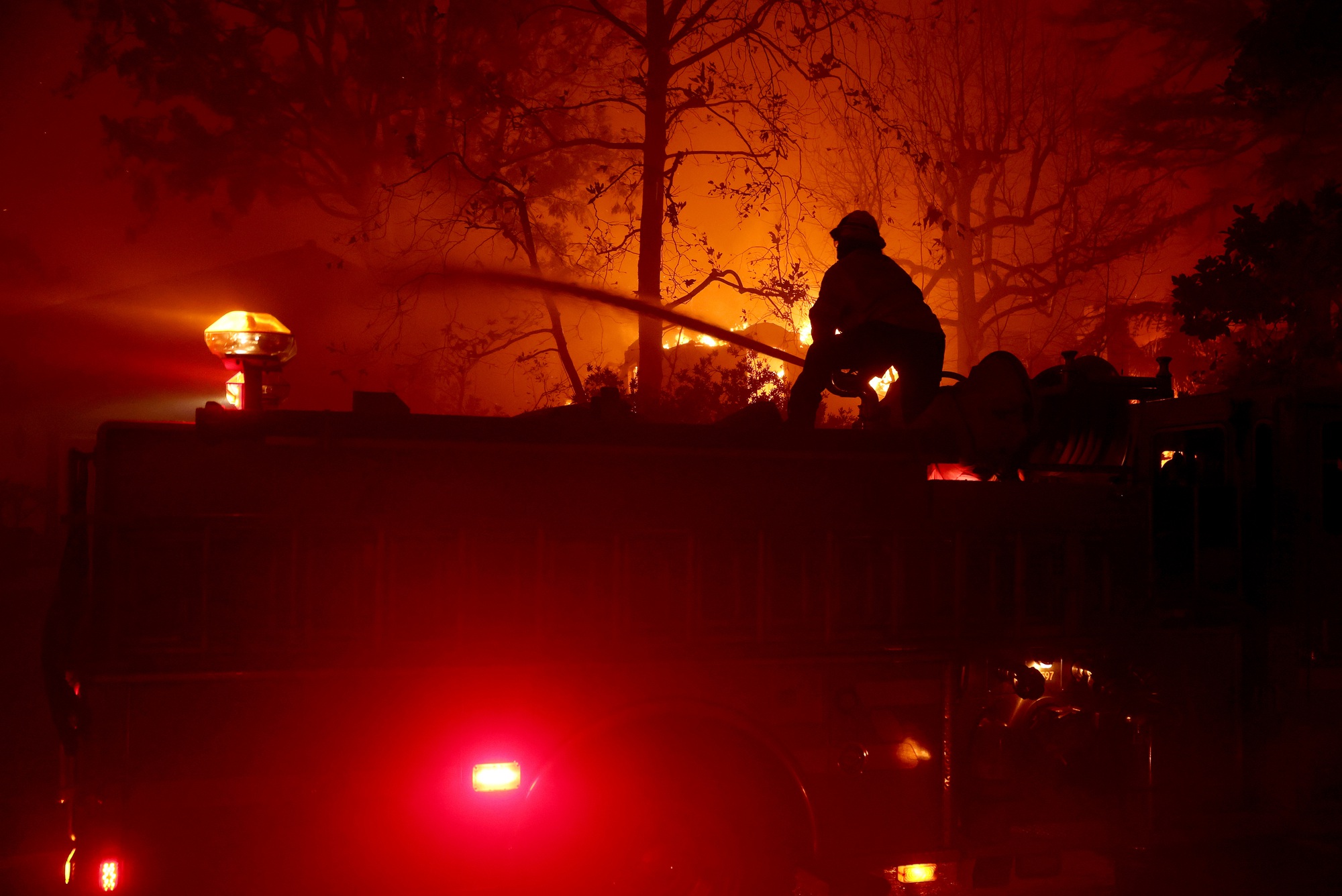 Lính cứu hỏa Los Angeles phun nước vào một ngôi nhà đang cháy trong khi chiến đấu với Đám cháy Eaton vào ngày 8 tháng 1.