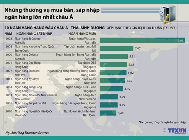 Đắt giá nhất là vụ mua bán của ngân hàng Westpac (Australia) khi thâu tóm ngân hàng St. George (Australia) với giá trị 17,93 tỷ USD.