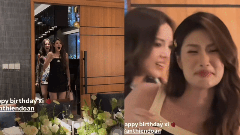 Ngay khi bước vào, nàng hậu gen Z lập tức đứng hình mất vài giây khi thấy không gian được trang trí bởi nhiều hoa tươi, cùng sự xuất hiện đầy bất ngờ của những người bạn thân thiết. Được Kỳ Duyên bí mật "đánh úp" trong ngày sinh nhật của Hoa hậu Đoàn Thiên Ân, khiến cô rưng rưng mếu máo xúc động.
