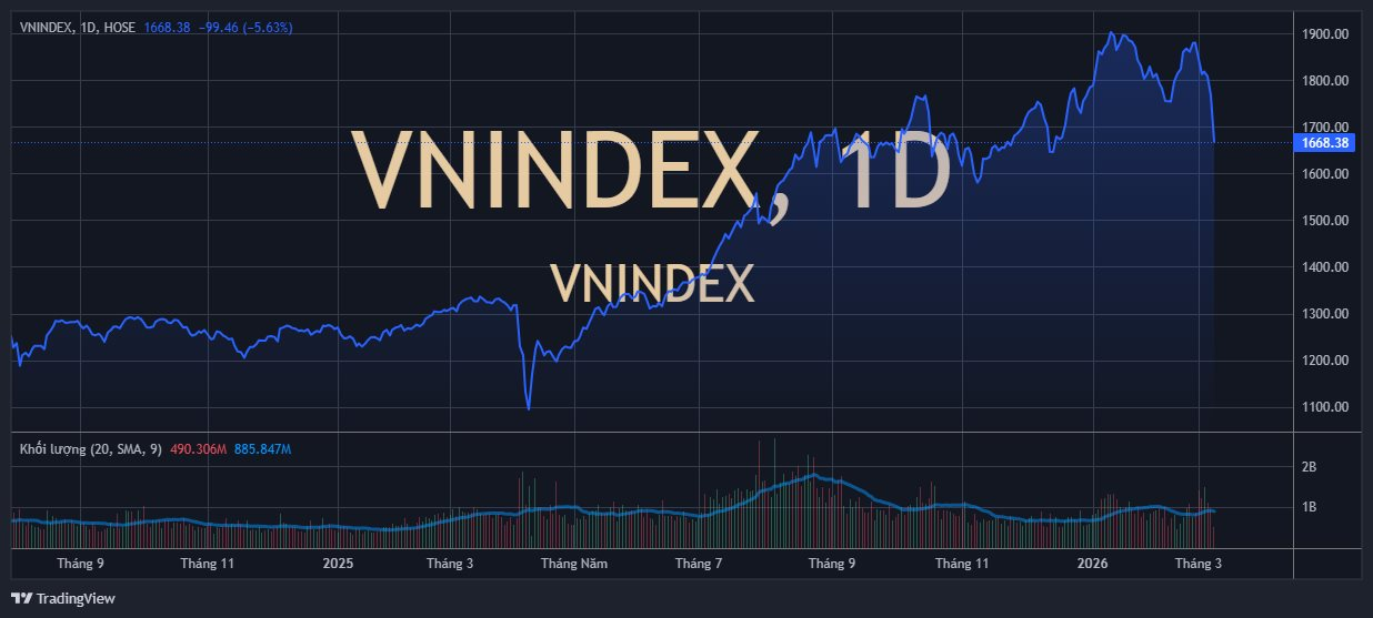 Chỉ sau hơn 15 phút giao dịch trong phiên sáng ngày 9/3, VN-Index đã sụt giảm 104 điểm, lùi xuống còn 1.663 điểm (tại thời điểm 9h33). Đây là mức giảm mạnh nhất lịch sử của VN-Index tính theo số tuyệt đối. Toàn bộ thành quả tăng kể từ đầu năm gần như bị xóa sạch, đưa thị trường về vùng thấp nhất kể từ giữa tháng 12/2025.