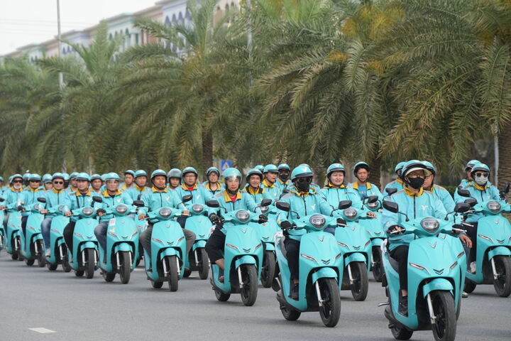 Màn diễu hành "không phát thải" quy mô lớn, với sự tham gia của 100 xe máy điện Xanh SM, 500 xe đạp và hơn 100 ô tô điện VinFast. (Nguồn: Vingroup)