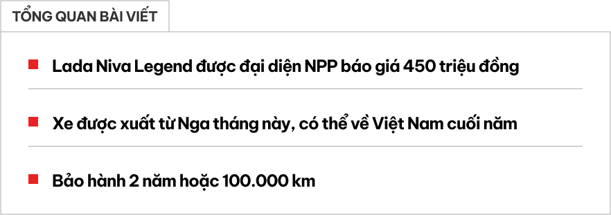 Theo thông tin từ đại diện phía AvtoVAZ tại Việt Nam, Lada Niva Legend đã hoàn tất thủ tục kiểm định. Chiếc xe xuất hiện trong nước thời gian gần đây là xe mẫu. Lô Niva Legend chính thức dự kiến bắt đầu được đưa về nước từ Nga vào cuối tháng 9 này, ước tính cập cảng Việt Nam khoảng tháng 12/2025 hoặc tháng 1/2026.