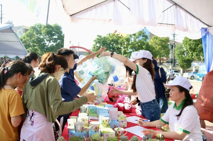 Tại khuôn viên một trường học ở thành phố Lạng Sơn, hàng trăm học sinh và người dân háo hức mang theo vỏ chai nhựa, lon nước, túi nilon... để đổi lấy những món quà nhỏ như cây xanh, sổ tay tái chế, túi vải, bình nước inox. Chỉ trong buổi sáng, hàng chục kg rác thải nhựa đã được thu gom.