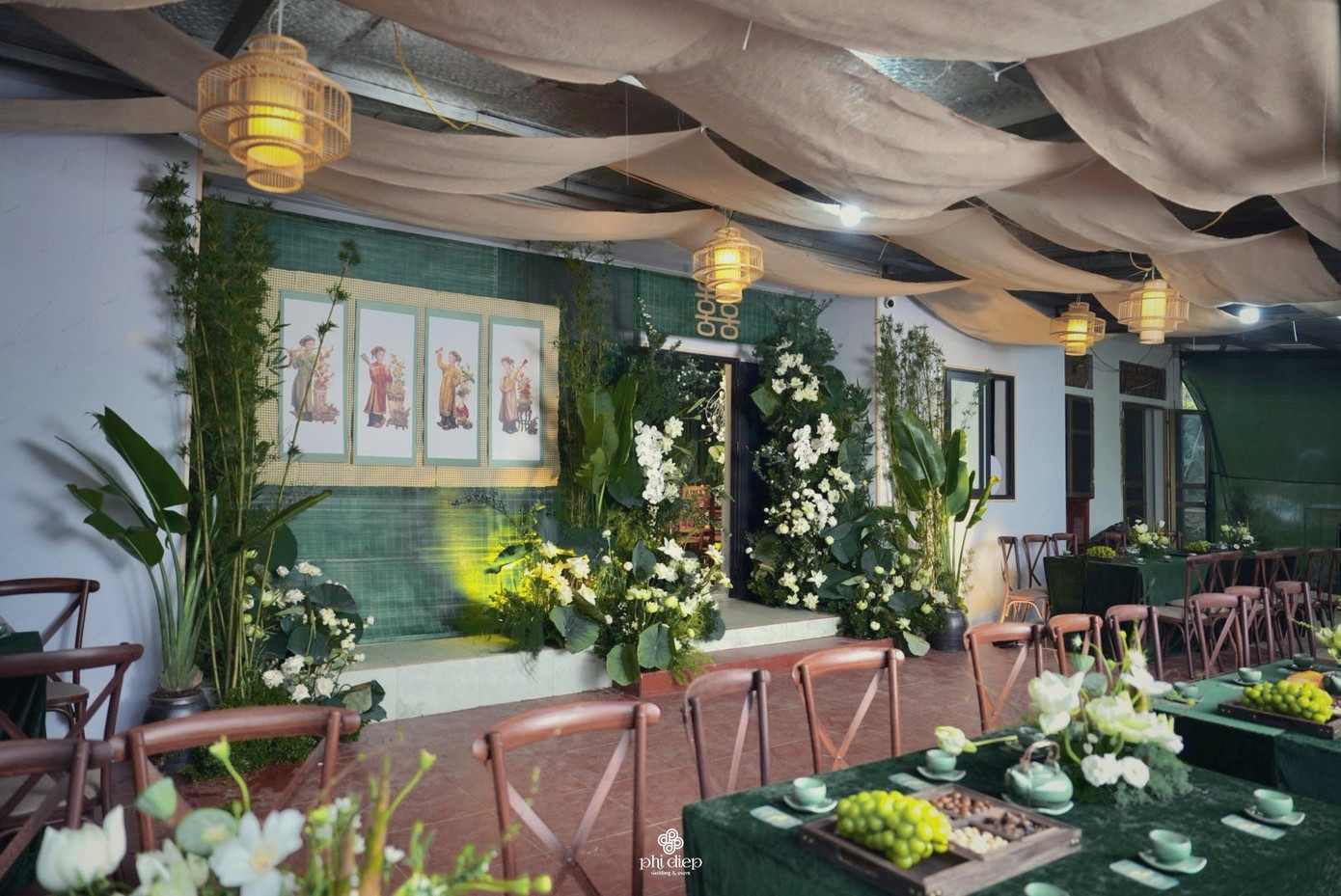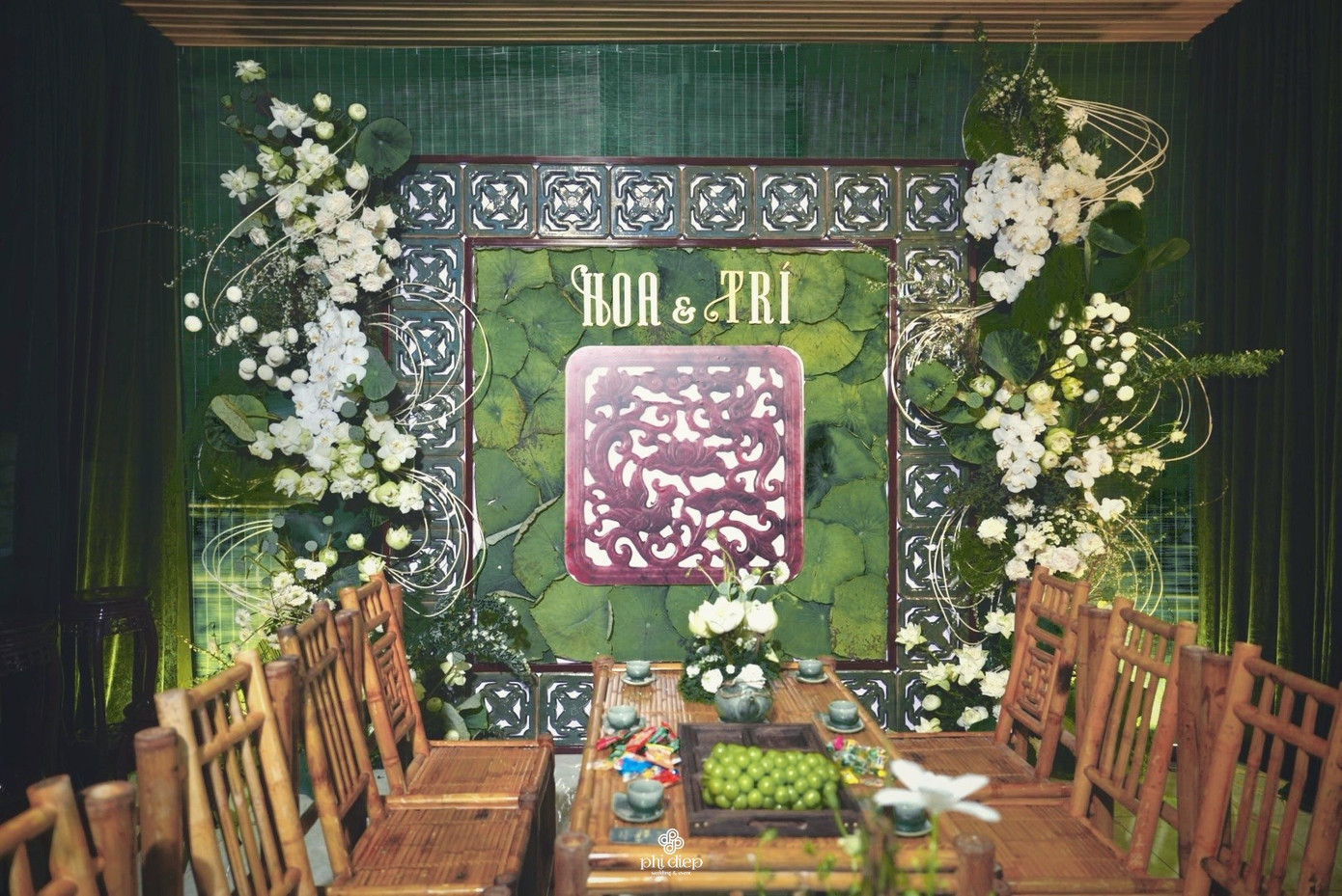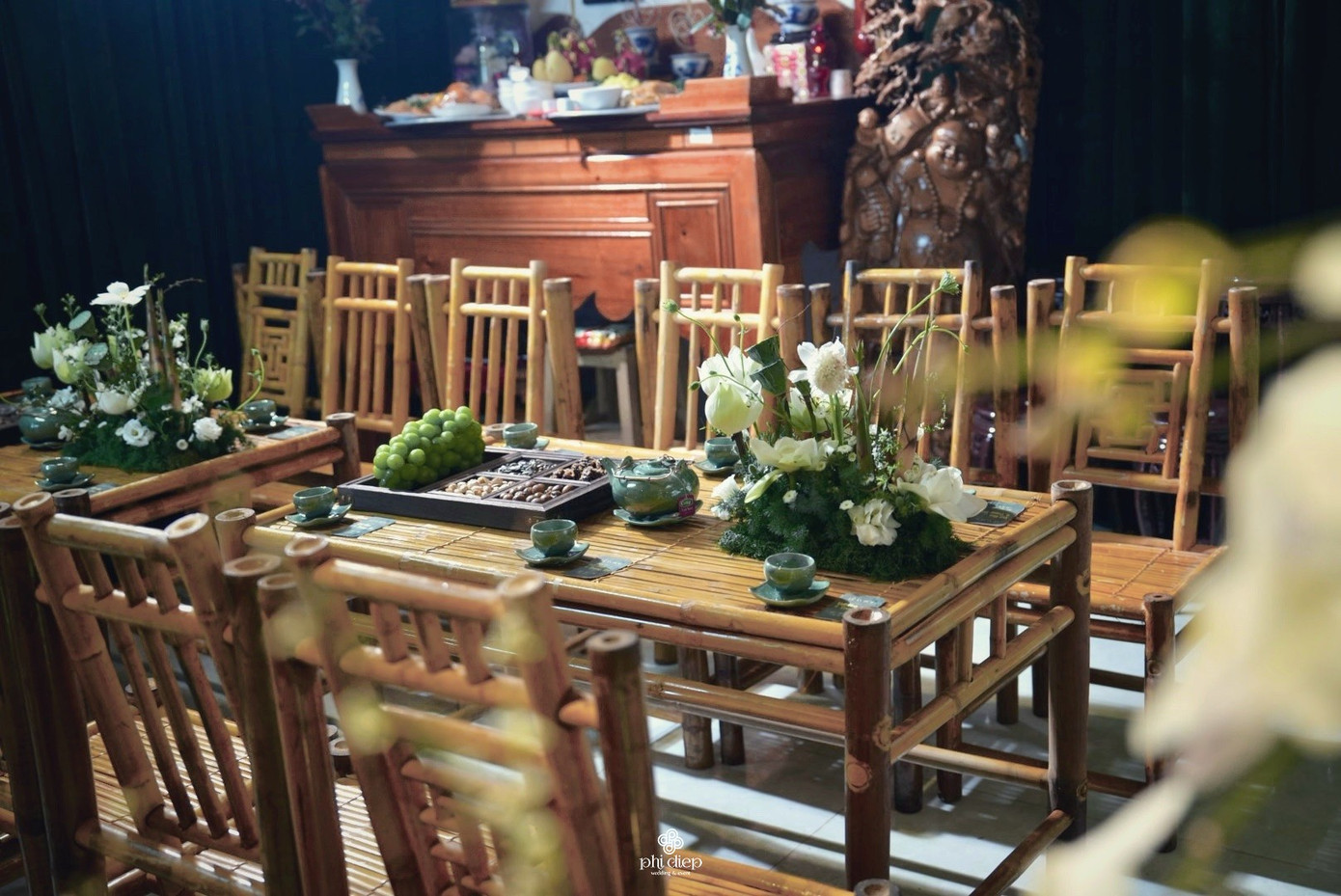 Trên bàn gia tiên và bàn tiệc, hoa sen trắng được kết hợp cùng măng tre và các loại hoa tươi, gợi nhắc hình ảnh làng quê Bắc Bộ. Ê-kíp tổ chức cũng sử dụng nhiều chi tiết truyền thống như bàn ghế tre, tráp hỏi khung tre, vải bố canvas che trần và các chi tiết mây đan…