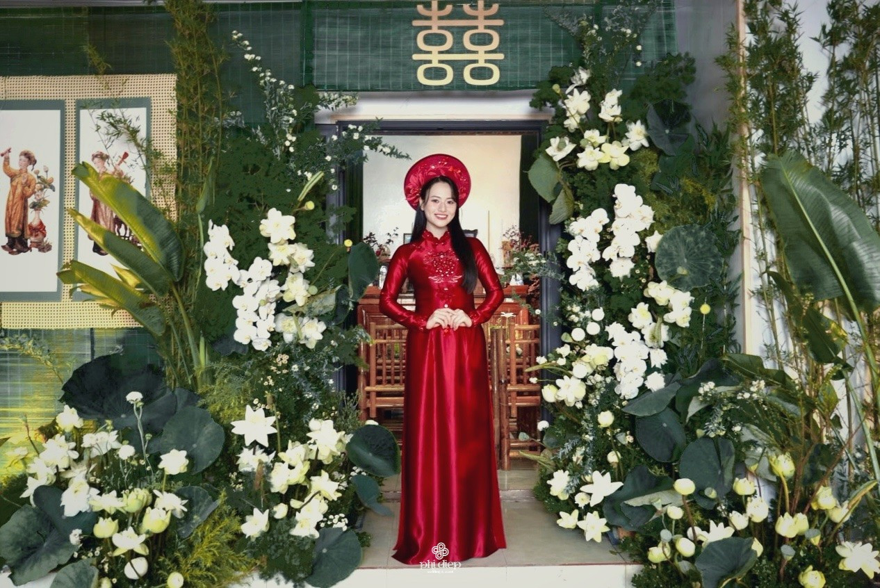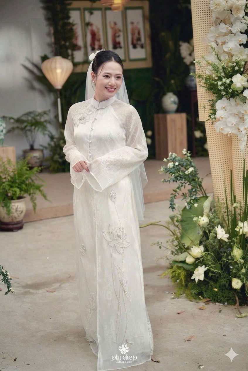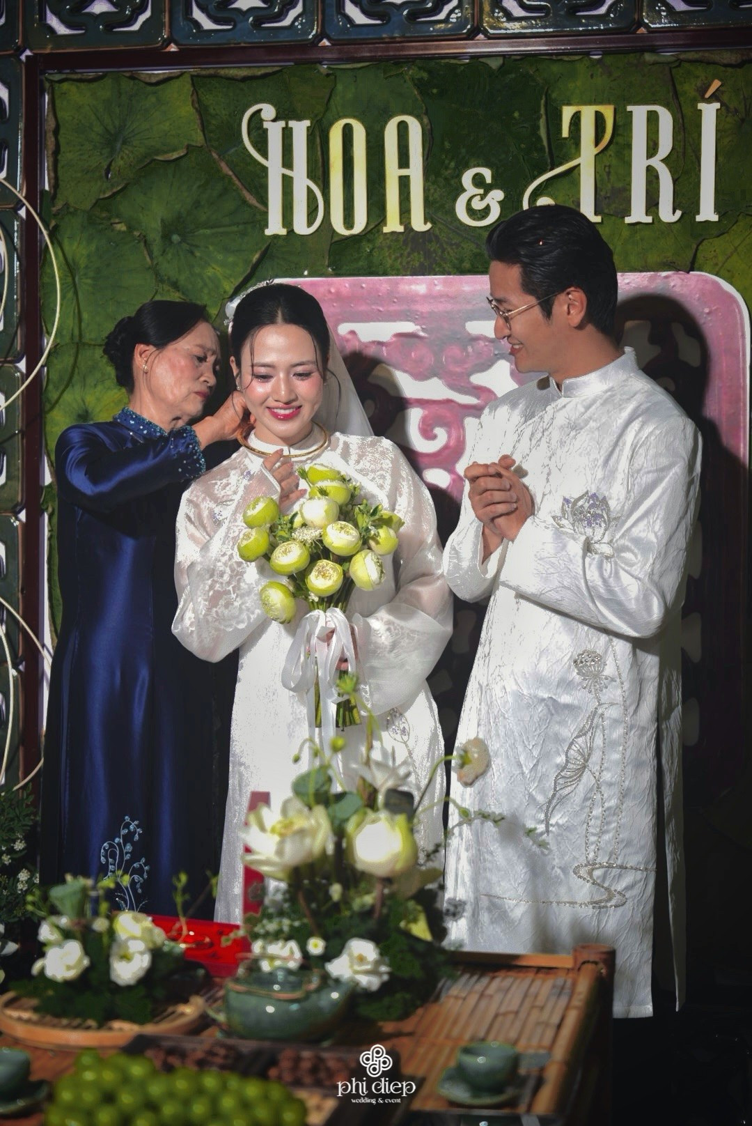 Trong ngày trọng đại, Việt Hoa và Trọng Trí cùng diện áo dài trắng thêu hoa sen tinh tế. Không gian buổi lễ được trang trí chủ đạo với tông trắng và xanh, nổi bật với những đóa hoa sen - loài hoa cô dâu đặc biệt yêu thích.