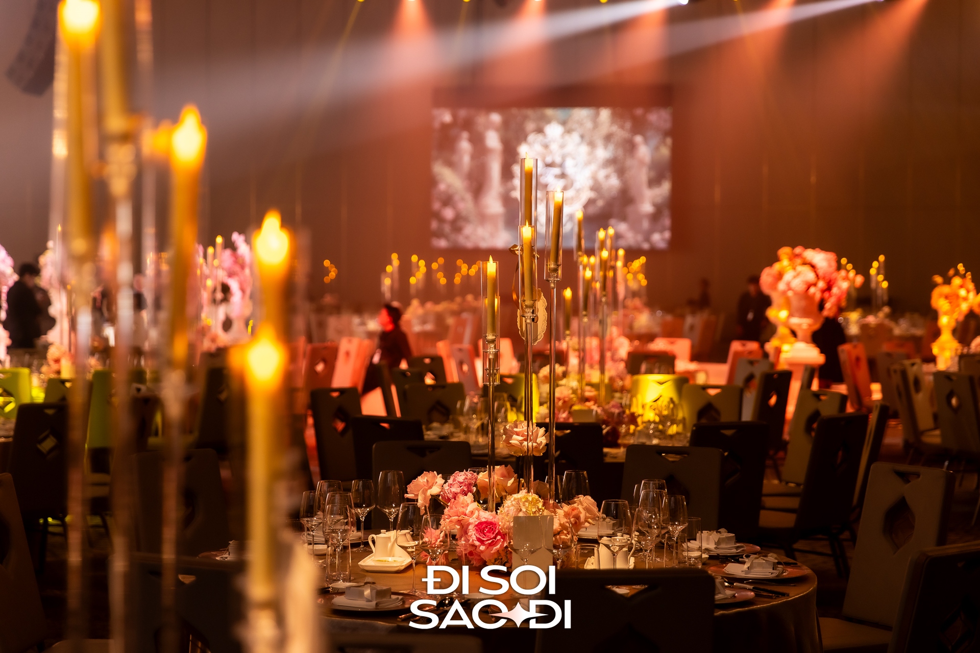 Theo ghi nhận của chúng tôi, trước thời điểm đón khách, toàn bộ không gian tiệc đã được hoàn thiện với quy mô khủng. Khu vực sảnh và lối vào được phủ kín bởi hàng nghìn bông hoa tươi nhập khẩu, biến địa điểm tổ chức thành một khu vườn địa đàng lung linh. Hệ thống đèn, sân khấu, bàn tiệc đều được chăm chút theo tông màu trắng – hồng, cam, đỏ mang cảm giác sang trọng nhưng vẫn mềm mại, đúng tinh thần lãng mạn mà cô dâu Tiên Nguyễn yêu thích.