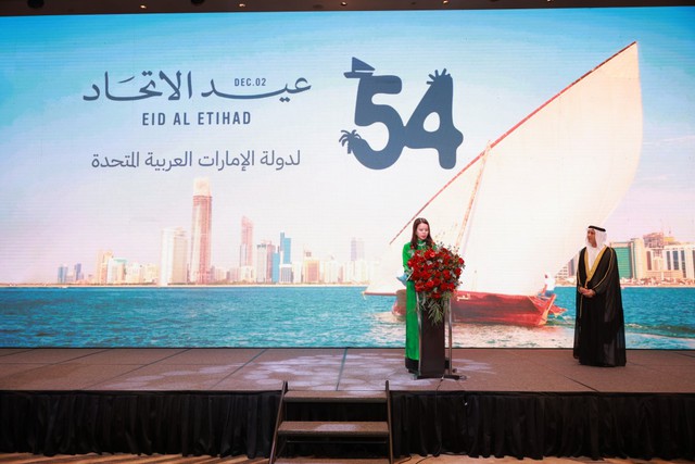 Phát biểu chúc mừng tại lễ kỷ niệm, Thứ trưởng Nguyễn Minh Hằng bày tỏ “vui mừng khi cùng quý vị kỷ niệm 54 năm Quốc khánh UAE”, đồng thời gửi lời chúc mừng chân thành của Chính phủ và nhân dân Việt Nam tới đất nước UAE.