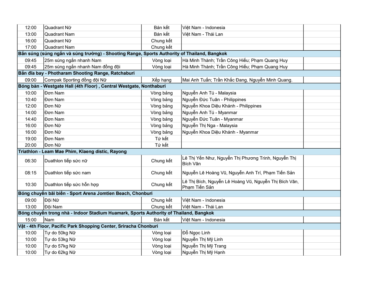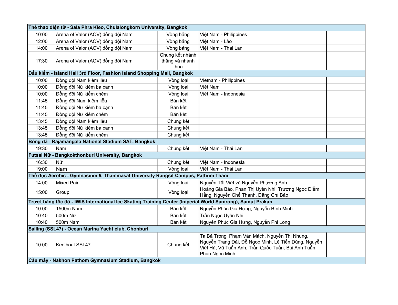 Chi tiết lịch thi đấu: