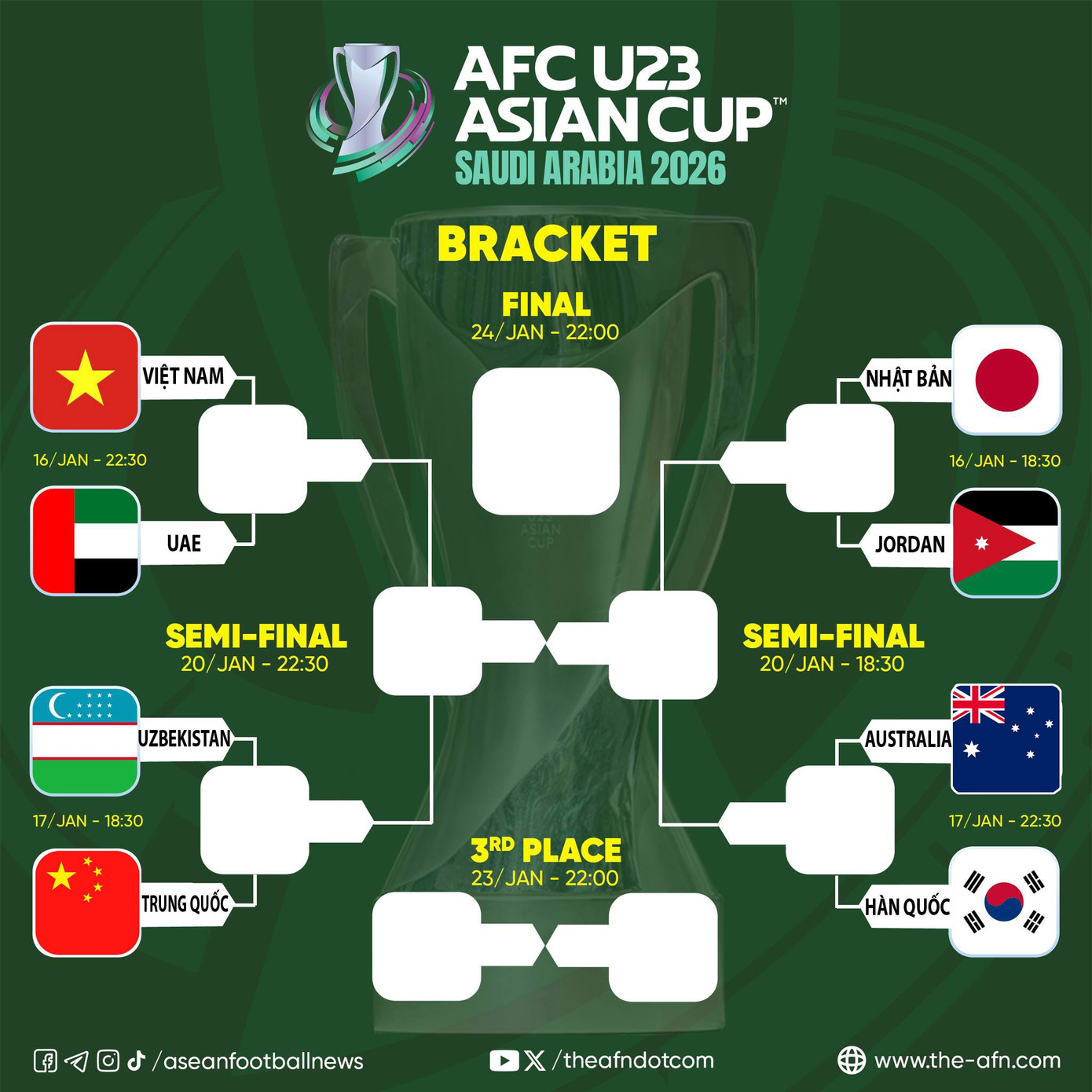 Trong các cặp đấu, người hâm mộ Việt Nam chắc chắn chờ đợi vào cuộc so tài giữa thầy trò HLV Kim Sang-sik và U23 UAE . Đối thủ của U23 Việt Nam chưa bao giờ giành vé vào bán kết U23 châu Á. Ngoài 2 lần vào tới tứ kết, U23 UAE chủ yếu bị loại từ vòng bảng. Vì vậy, lần gặp nhau tới là cơ hội để U23 Việt Nam “giải quyết” đối thủ này.