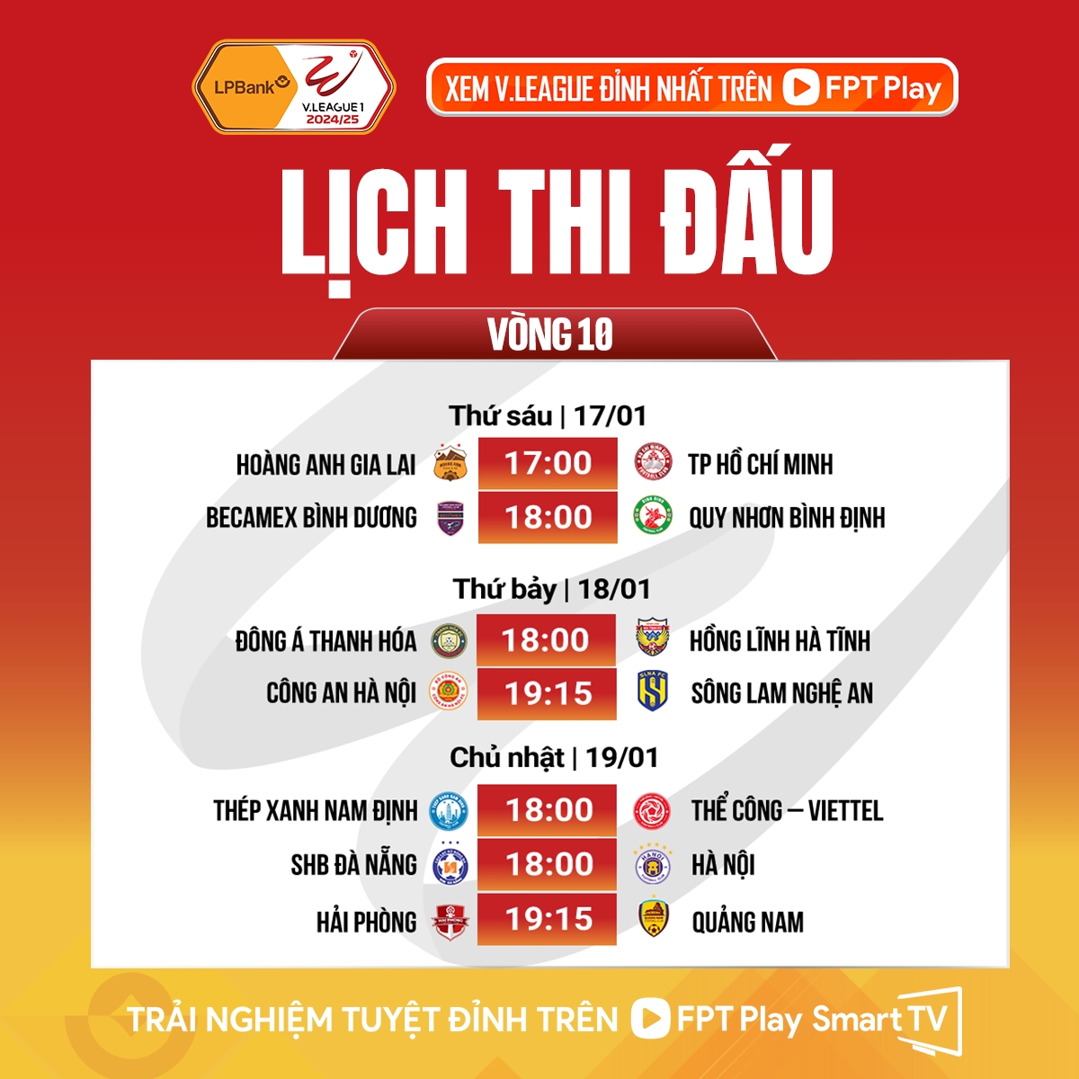 Tại sân chơi V-League 2024/2025 sẽ diễn ra 3 trận đấu tiếp theo của vòng 10. Ở khung 18h ngày hôm nay 19/1 sẽ diễn ra 2 trận đấu, đó là cuộc so tài của Nam Định với Thể Công Viettel và Đà Nẵng với Hà Nội FC. Ở khung 19h15, Hải Phòng sẽ tiếp đón Quảng Nam tại Lạch Tray.