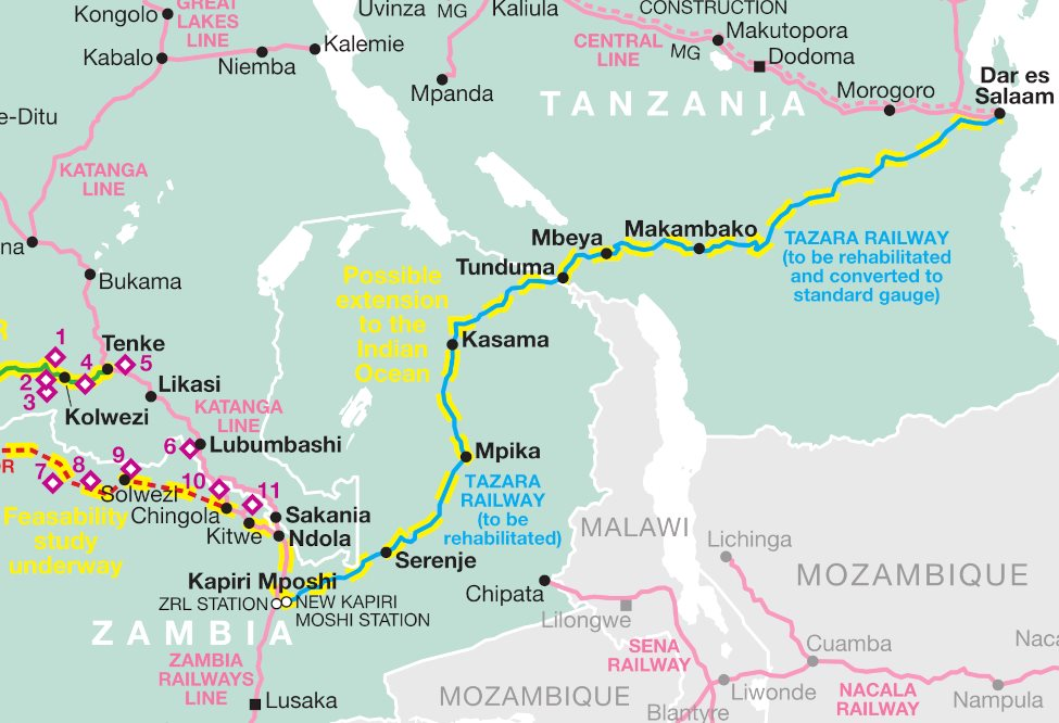 Ở hướng ngược lại, tuyến đường sắt TAZARA dài 1.860 km dẫn tới Tanzania, kết nối các khu vực giàu khoáng sản của Zambia và DRC với một cảng bên Ấn Độ Dương, giúp rút ngắn thời gian vận chuyển bằng đường biển tới Trung Quốc và các thị trường châu Á khác.