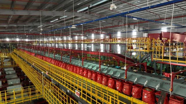 Hình ảnh túi tái sinh với chất liệu bền bỉ, thân thiện với môi trường được sử dụng tại Trung tâm trung chuyển của doanh nghiệp chuyển phát nhanh