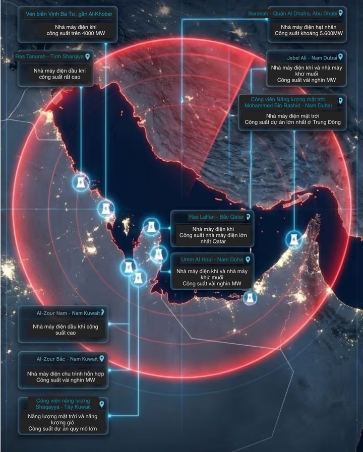 Tiếp đến là các nhà máy điện. Các quan chức Iran đã cảnh báo về "tình trạng mất điện trên diện rộng" nếu lưới điện của họ bị tấn công.