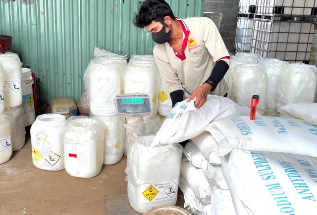 Tại thời điểm kiểm tra, lực lượng chức năng phát hiện bên trong khu vực nhà xưởng có diện tích khoảng 1000m2 có 4 công nhân đang làm việc và kho hàng có diện tích khoảng 150m2 của Công ty chứa nhiều hóa chất sử dụng làm nguyên liệu sản xuất, công cụ, phương tiện sản xuất và hàng hóa thành phẩm.