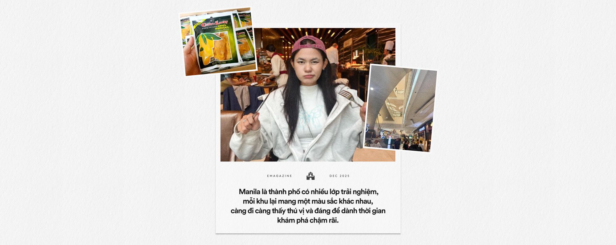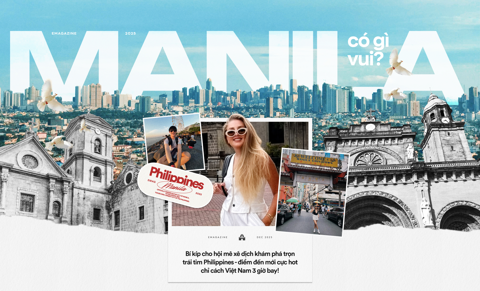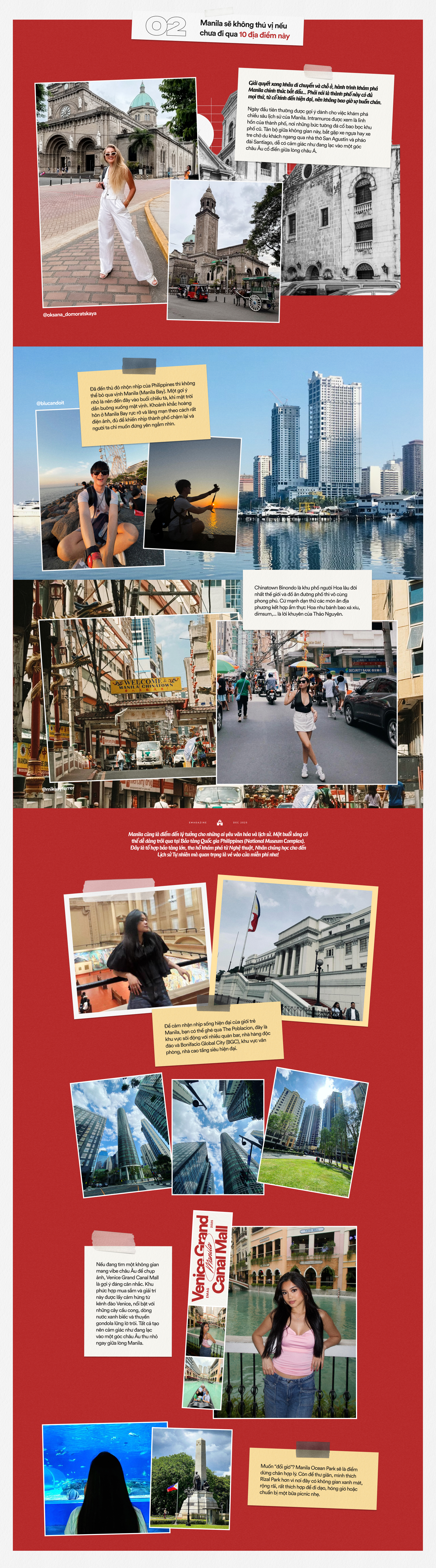 "Tại sao là Manila?" là câu hỏi Thảo Nguyên nhận được khá nhiều về chuyến đi này. Với cô, Manila hấp dẫn ngay từ yếu tố khoảng cách khi chỉ mất khoảng 3 giờ bay từ Việt Nam. Thành phố mang trong mình sự giao thoa thú vị giữa nét cổ kính, lãng mạn phảng phất châu Âu và nhịp sống trẻ trung, sôi động rất châu Á. Không quá ồn ào, náo nhiệt như Bangkok, cũng không hào nhoáng như Singapore, Manila vừa đủ nhẹ nhàng nhưng vẫn đầy năng lượng, khiến Thảo Nguyên muốn khám phá và quay lại thêm nhiều lần nữa.