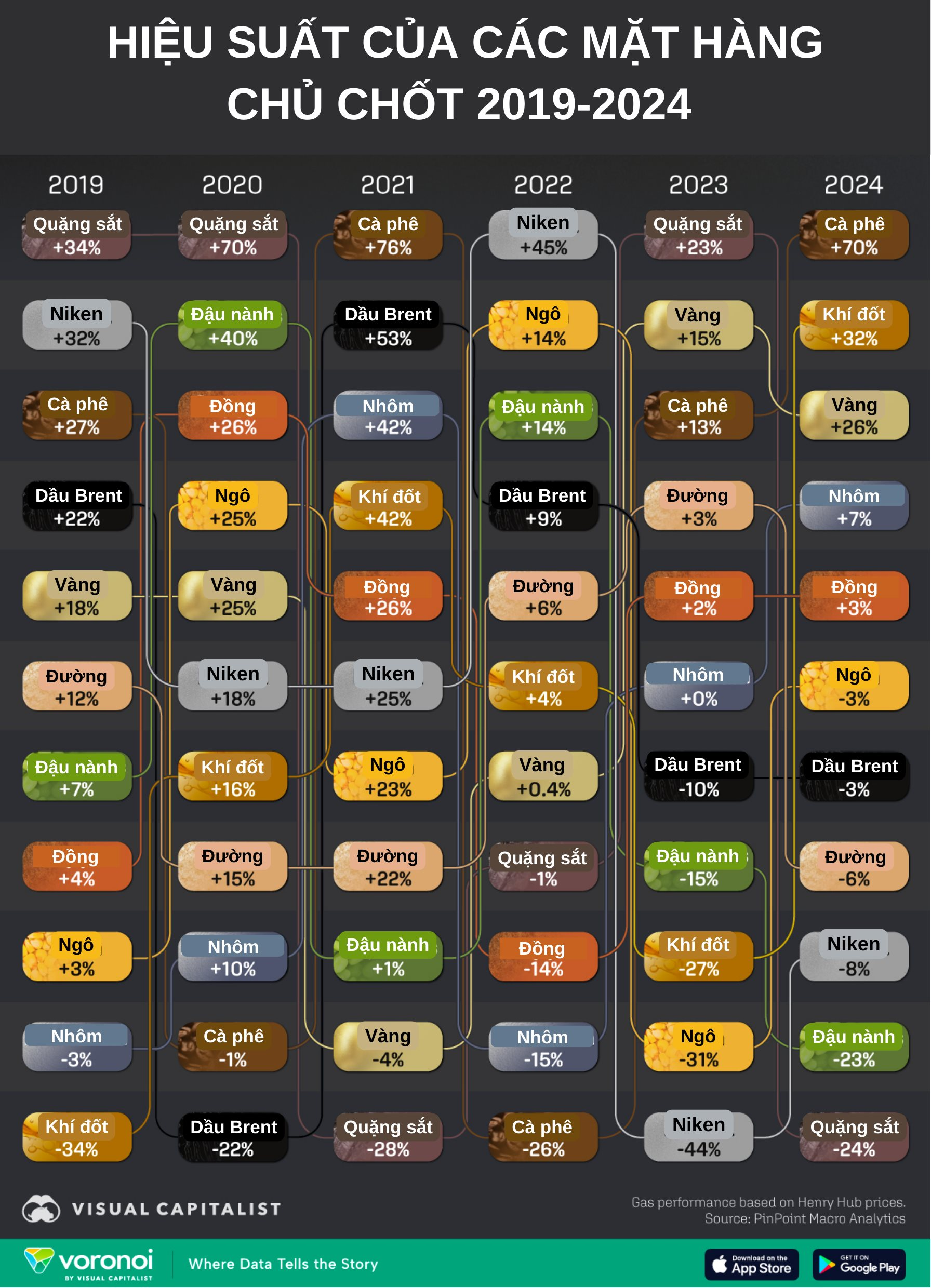 Hàng hóa đã có sự biến động đáng kể trong nhiều năm qua do tác động từ đại dịch COVID-19, gián đoạn chuỗi cung ứng và căng thẳng địa chính trị. Visual Capitalist đã theo dõi dữ liệu và liệt kê hiệu suất tăng giảm của 11 mặt hàng chủ chốt trong giai đoạn 2019-2024.