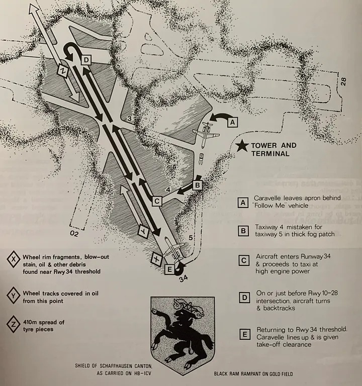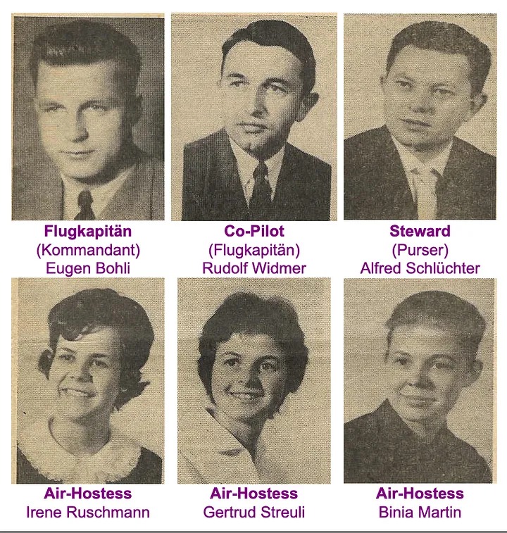 Cơ trưởng Eugen Bohli 37 tuổi với kinh nghiệm 7.600 giờ bay. Cơ phó Rudolf Widmer 37 tuổi với số giờ bay tích luỹ là 6.000 giờ. Trong đó, họ có 380 giờ bay với dòng Caravelle. Trong khi đó, chiếc máy bay chở khách lần này là một chiếc Caravelle mới được giao chưa đầy 1 năm.